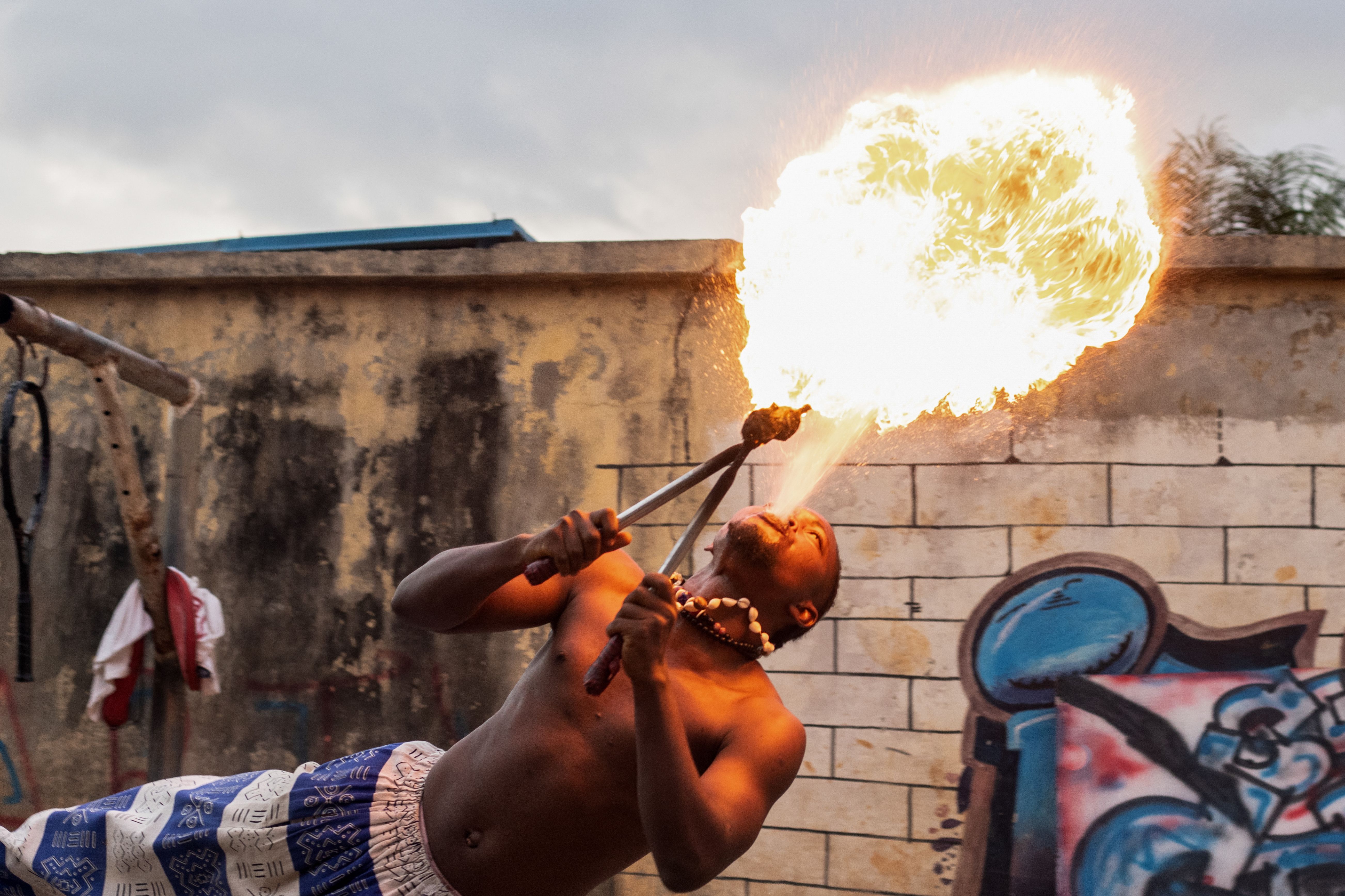A fire breather performs during a slum party in Oworonshoki district of Lagos, Nigeria, 24 September, 2024. The slum party is a yearly artistic dance festival initiated by Ennovate Dance House. It highlights the positive sides of the slum community and brings hope to the inhabitants. (Photo by Emmanuel Adegboye/EPA/EFE)