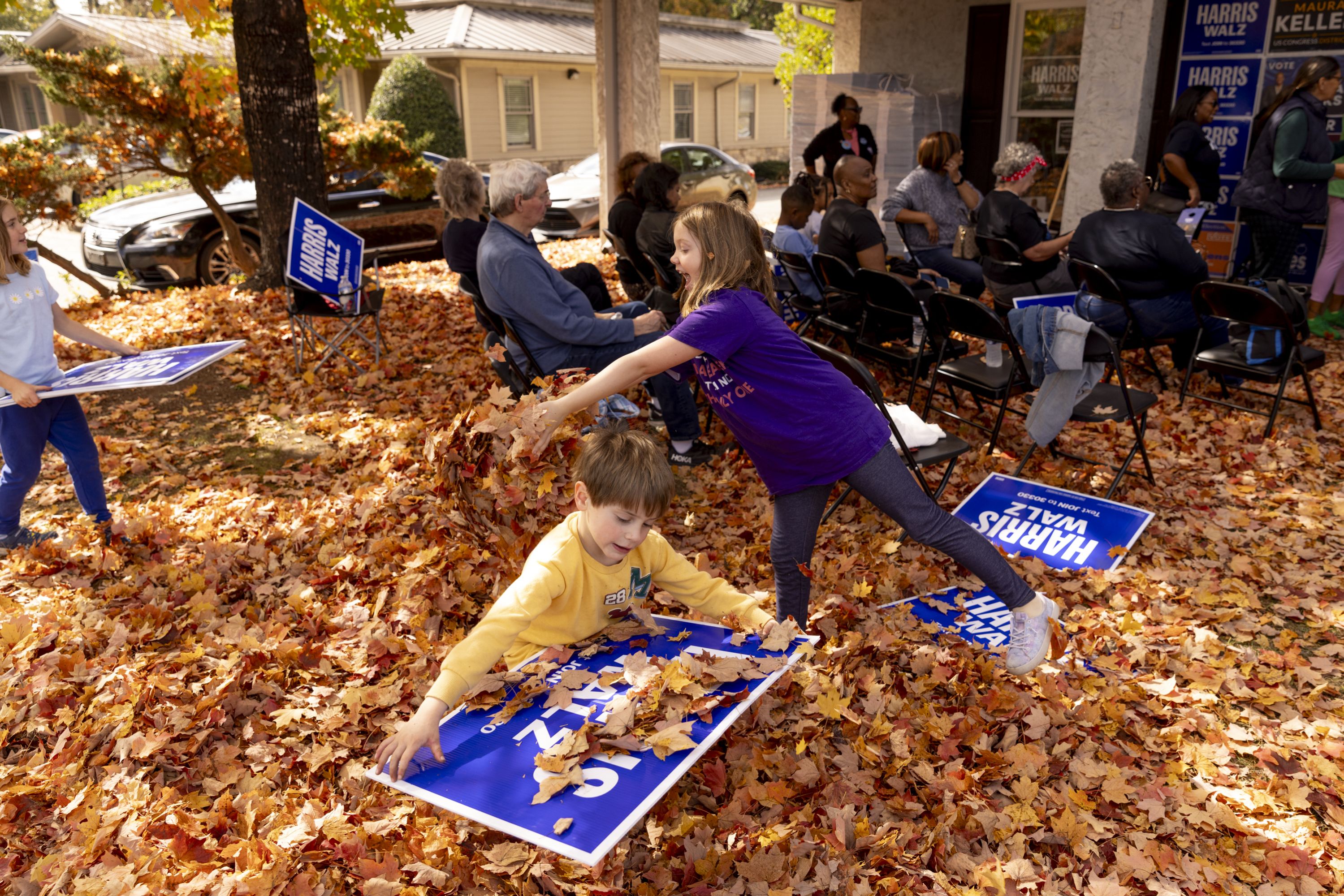 Laine Hollberg (right), 7, throws a pile of leaves while siblings Clover (left), 7, and Cliff Kambic (center), 4, play at the Fayette County Canvass Launch where Senator Ralph Warnock later spoke to a crowd in Fayetteville, Georgia on election day November 5, 2024. (Photo by Kendrick Brinson for The Washington Post)