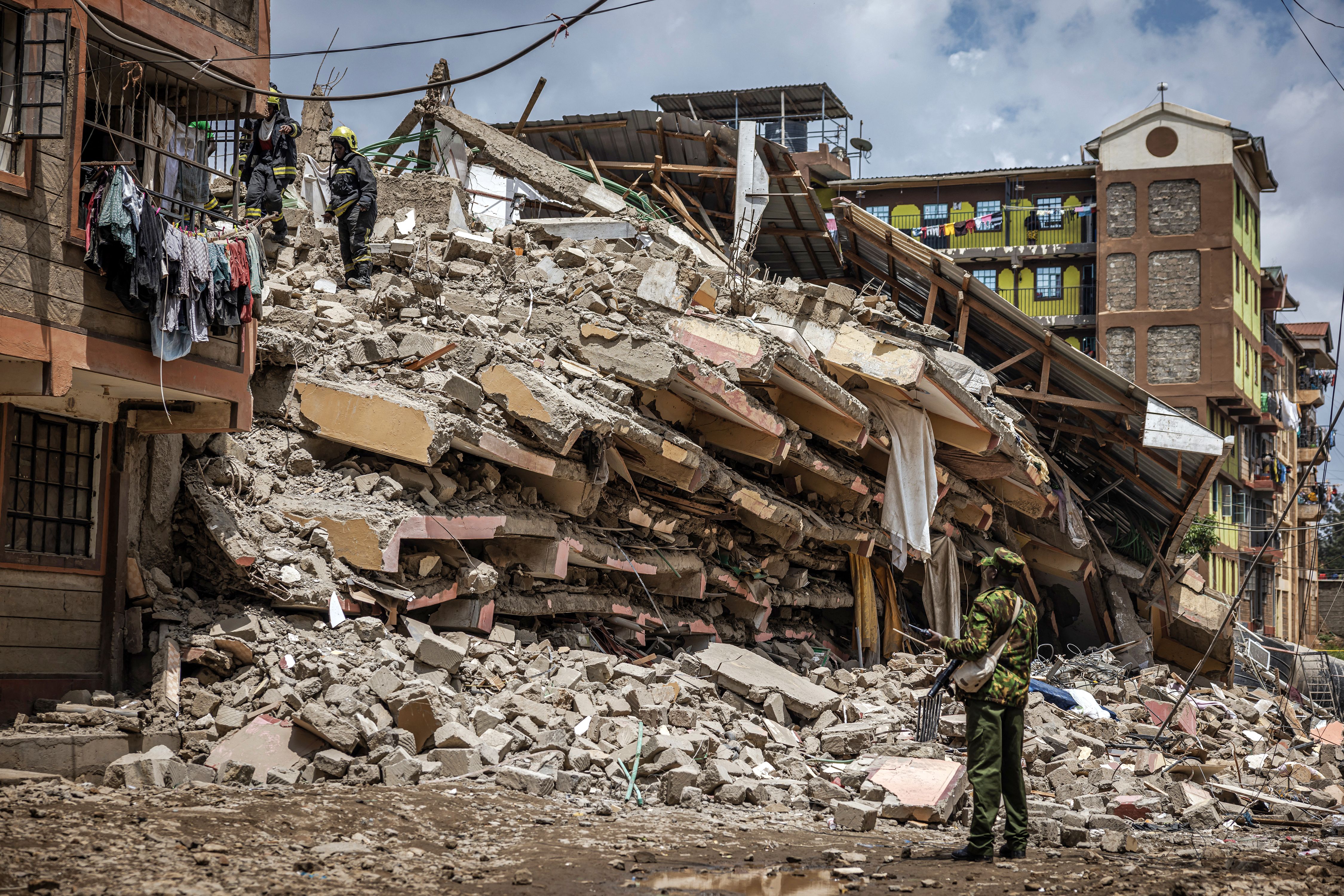 Kenya Police officer and Nairobi County emergency responders inspect the rubble of a collapsed residential building at Kahawa West residential area in Nairobi on October 20, 2024. Response teams were responding to a building collapse in Nairobi, where people are feared trapped despite a vacation notice. (Photo by Luis Tato/AFP Photo)
