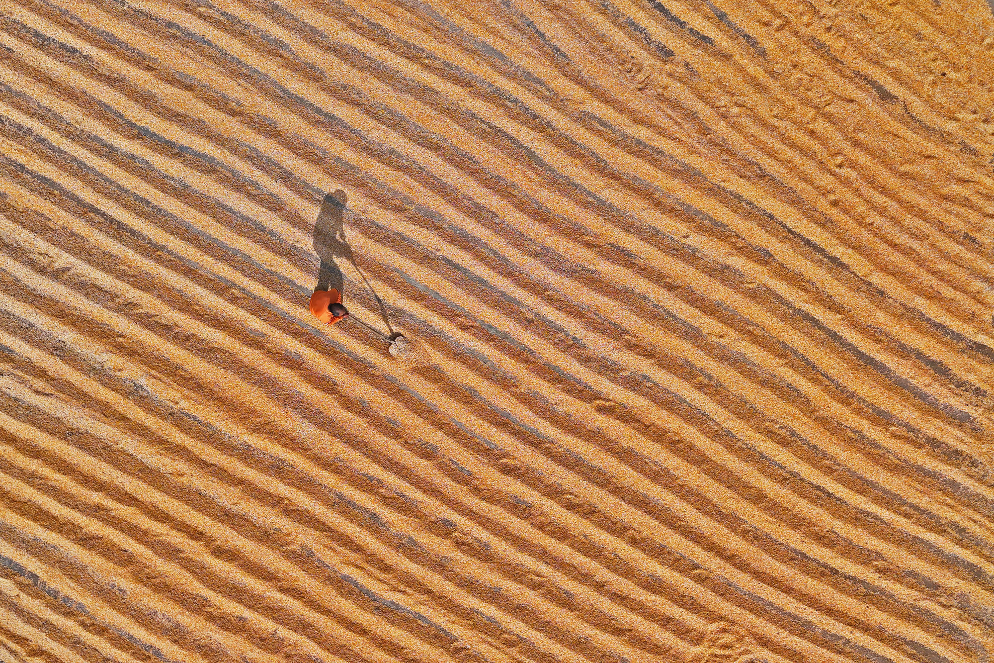 A farmer dries corn grains in a yard in Yantai in east China's Shandong province. (Photo by Sun Wentan/Feature China/Future Publishing via Getty Images)