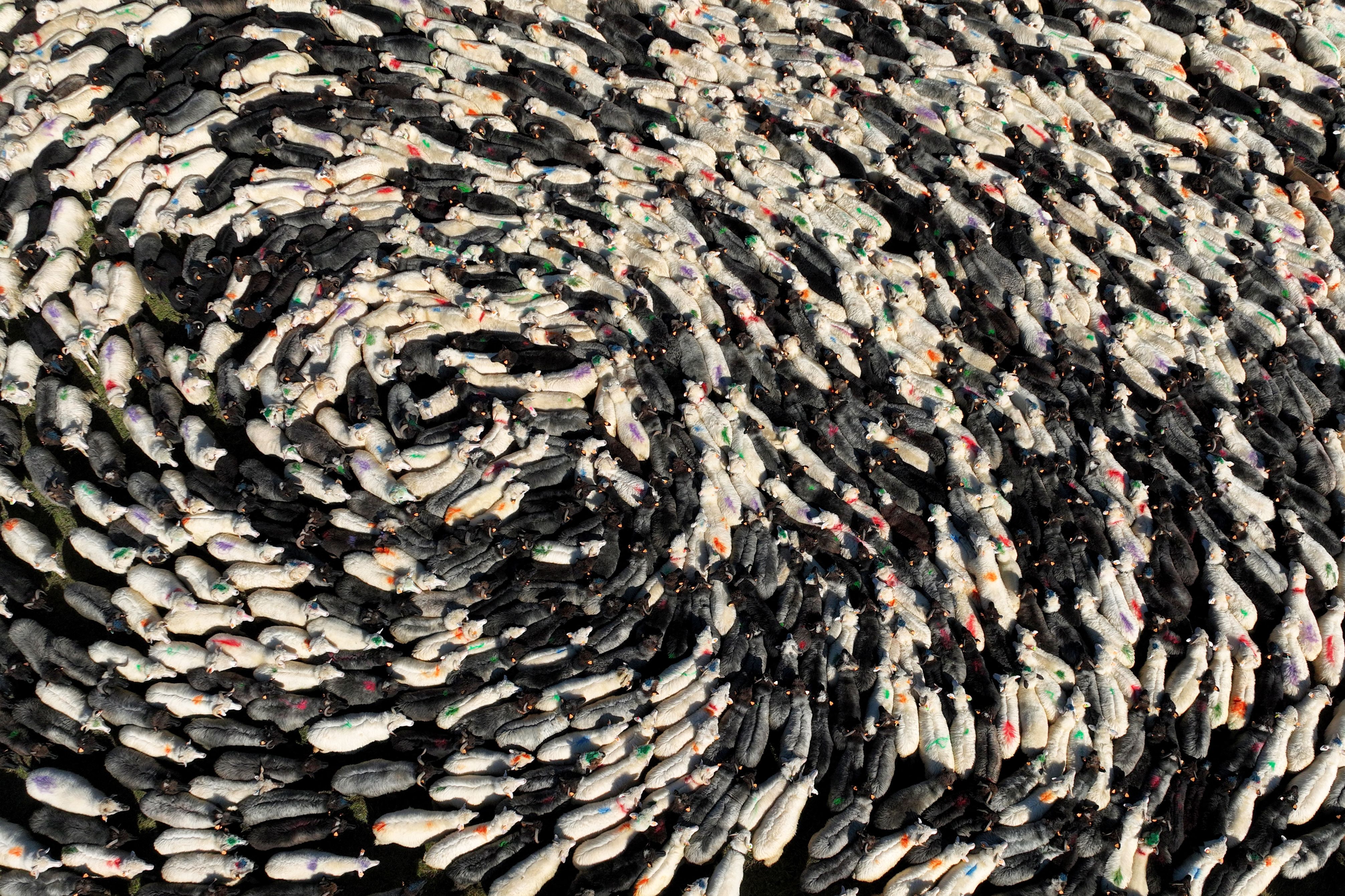 In this aerial photograph taken on October 19, 2024, white and black sheep are seen merging during the autumn “redyk”, a centuries-old highlander tradition marking the end of the grazing season by descending sheep from the mountains, in the village of Kluszkowce, Lesser Poland region. The way from summer pastures to wintering grounds often lasts several days and even a week, during which shepherds and their sheep cover dozens or even hundreds of kilometers. (Photo by Sergei Gapon/AFP Photo)