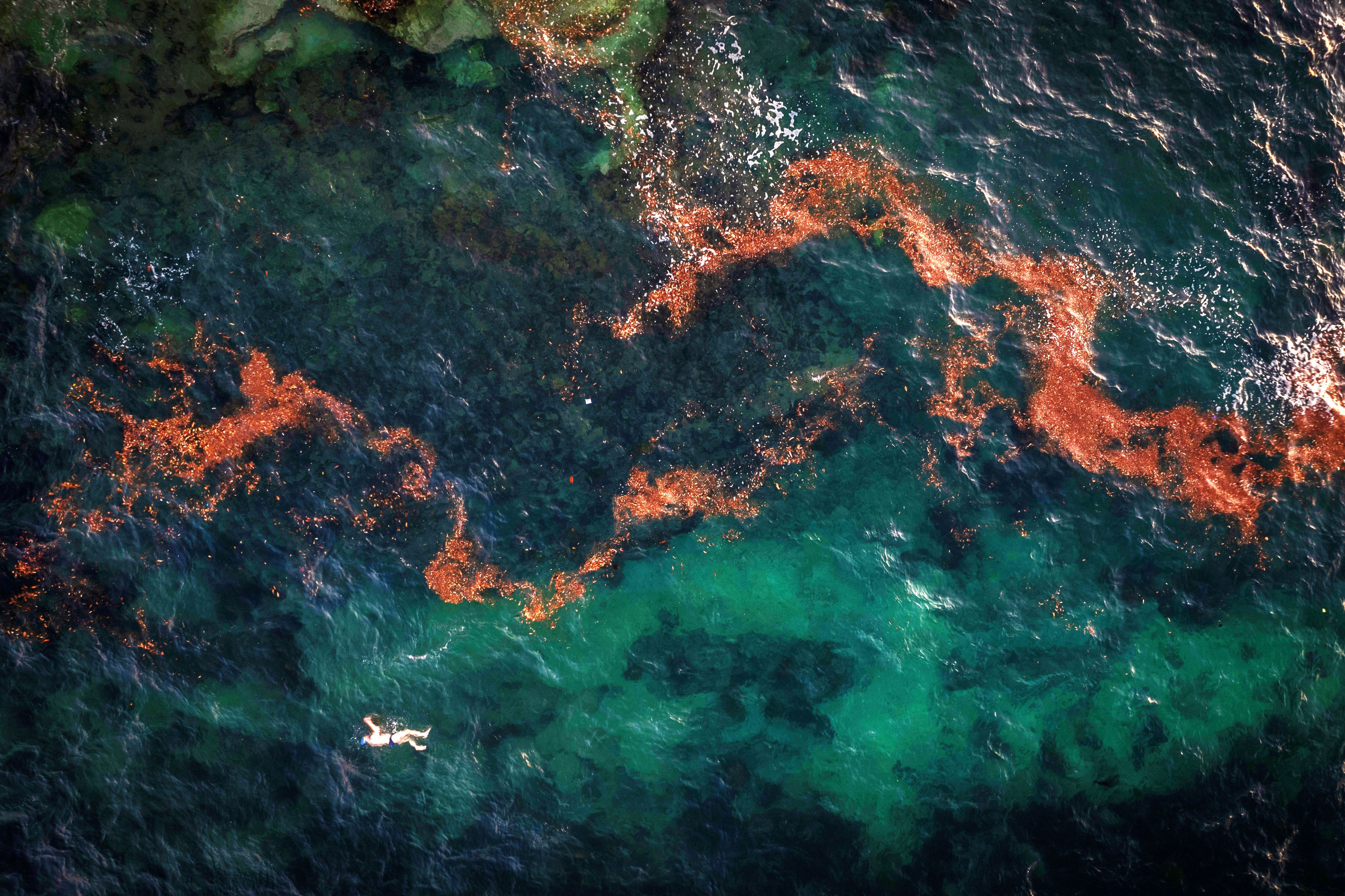 A lone swimmer is seen amongst a large line of floating debris at Clovelly Beach on October 17, 2024 in Sydney, Australia. Clovelly Beach is a few hundred metres north of Gordons Bay and Coogee beach, which are both closed due to a suspected oil spill. Thousands of 'tar balls' have been found across Eastern Suburbs beaches this week. (Photo by Brook Mitchell/Getty Images)