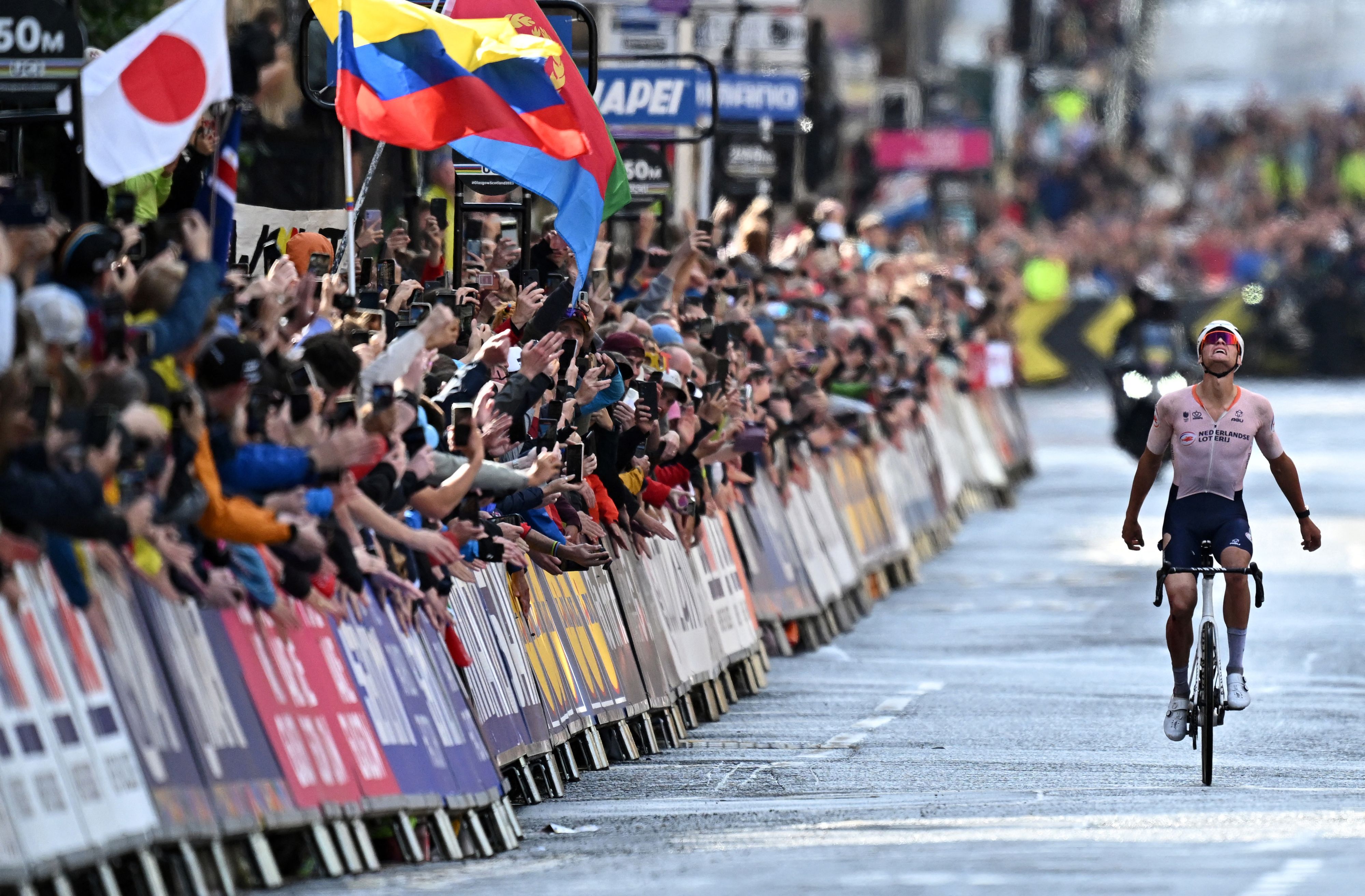 Netherland's Mathieu van der Poel reacts after winning the men's Elite Road Race at the Cycling World Championships in Edinburgh, Scotland on August 6, 2023. men's Elite Road Race at the Cycling World Championships in Edinburgh, Scotland on August 6, 2023. Netherland's Mathieu van der Poel took first place in the race that began in Scotland's capital city, Edinburgh, and ended with a street circuit in Glasgow. Belgium's Wout van Aert came second with Slovenia's Tadej Pogacar finishing in third place. (Photo by Oli Scarff/AFP Photo)
