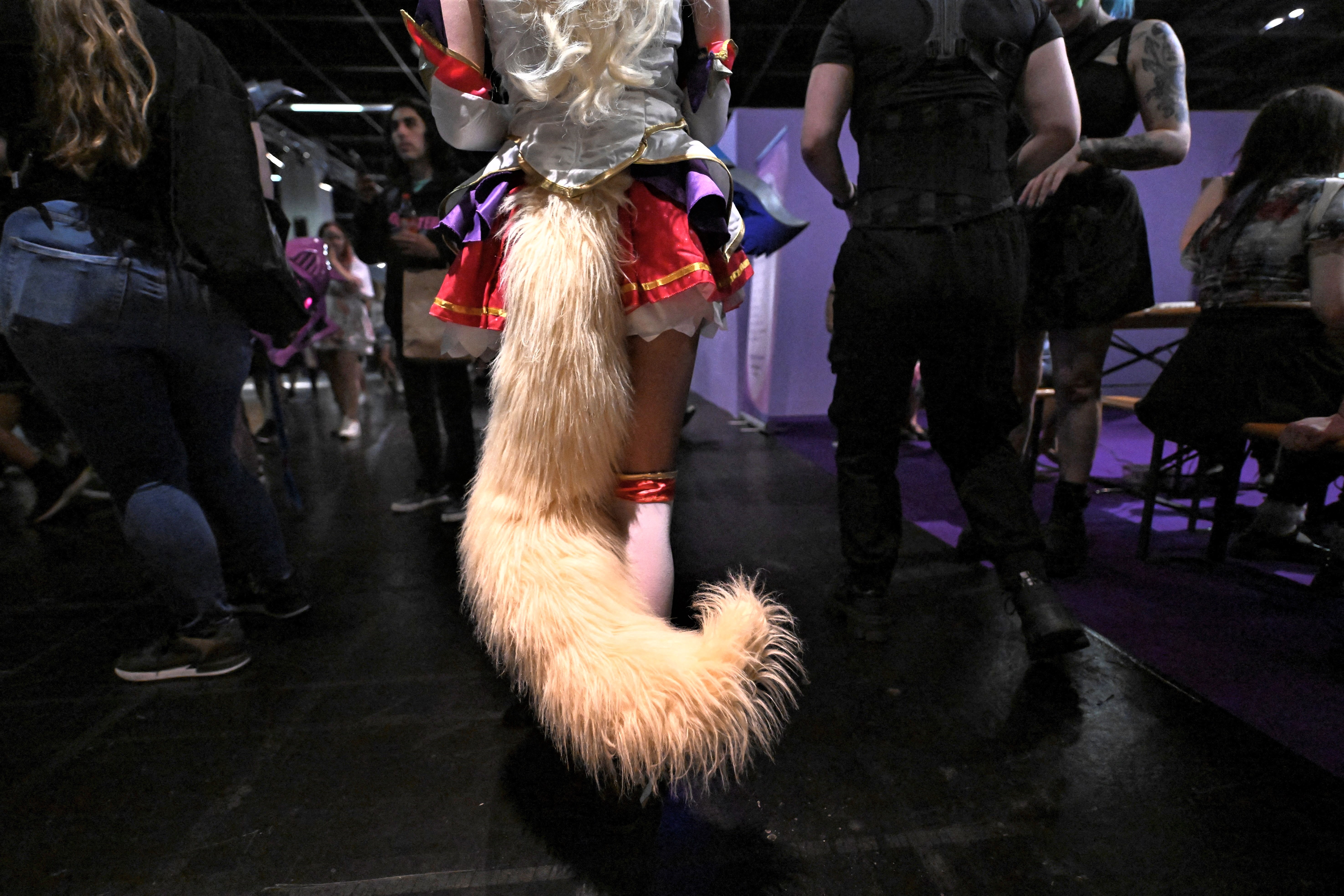 A person wearing a costume walks at the 2023 Gamescom computer and video game industry event in Cologne, Germany on August 24, 2023. (Photo by Jana Rodenbusch/Reuters)/