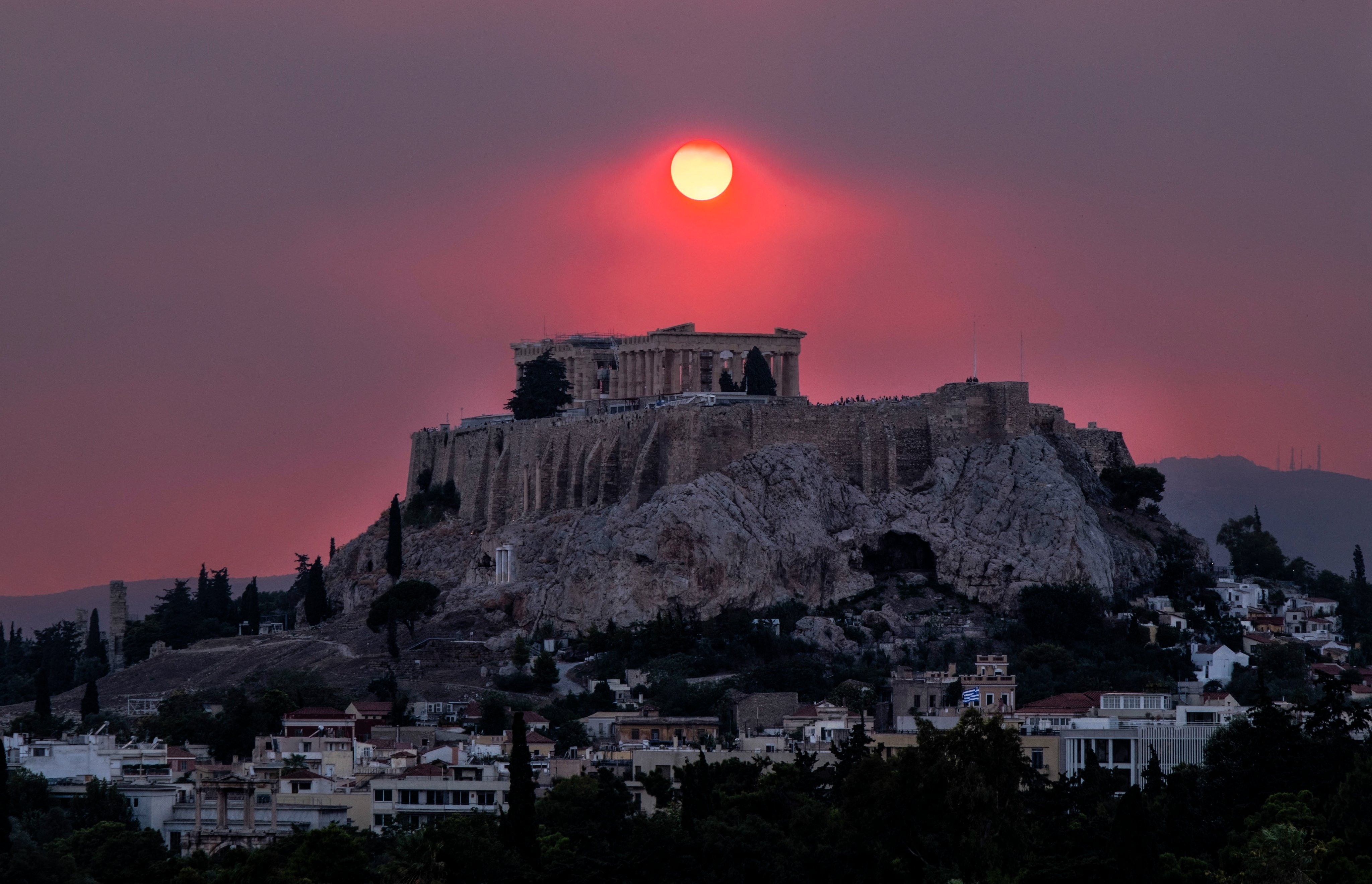 Smoke rises over the Acropolis Hill and the Parthenon from a wildfire that is burning at the western suburbs of the city of Athens, on August 22, 2023 (Photo by Andrea Bonetti/SOOC via AFP Photo)