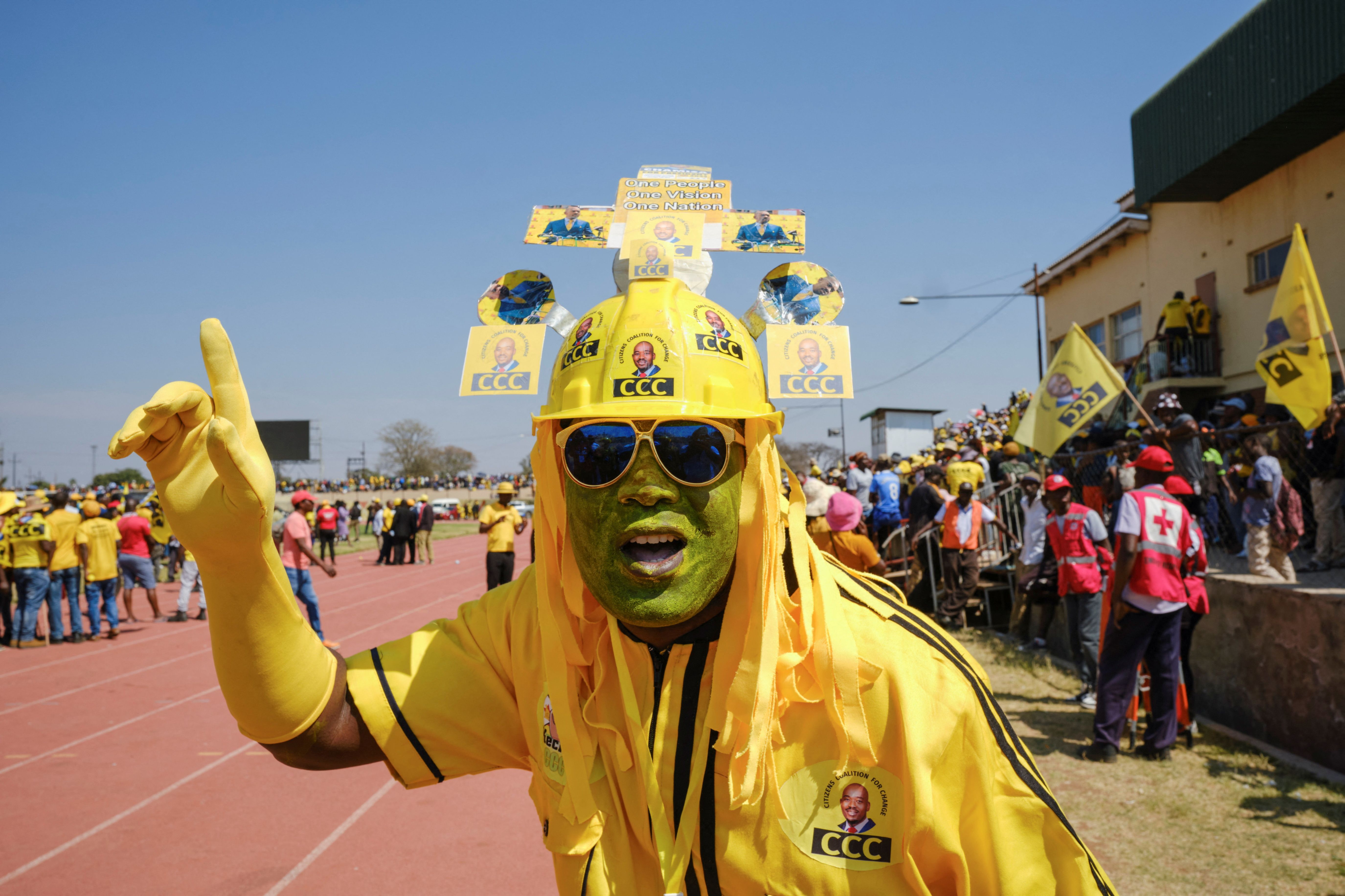A Citizens for Coalition Change (CCC) supporter poses for a photograph during the opposition party's election campaign rally at White City Stadium in Bulawayo, Zimbabwe on August 20, 2023. (Photo by K.B. Mpofu/Reuters)