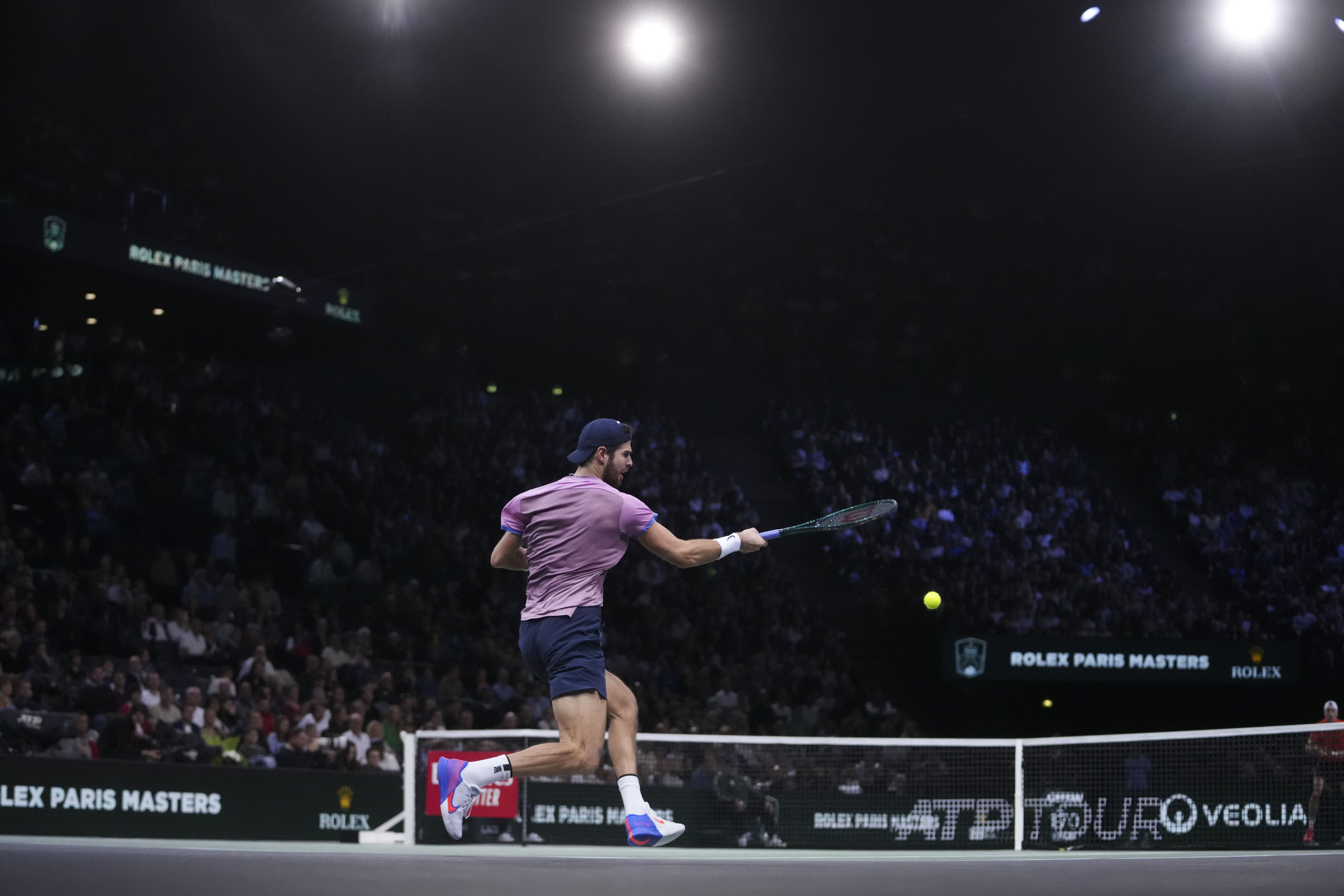 Russia's Karen Kachanov returns to France's Ugo Humbert during the semifinal match of the Paris Masters tennis tournament at the Accor Arena on Saturday, November 2, 2024, in Paris. (Photo by Thibault Camus/AP Photo)