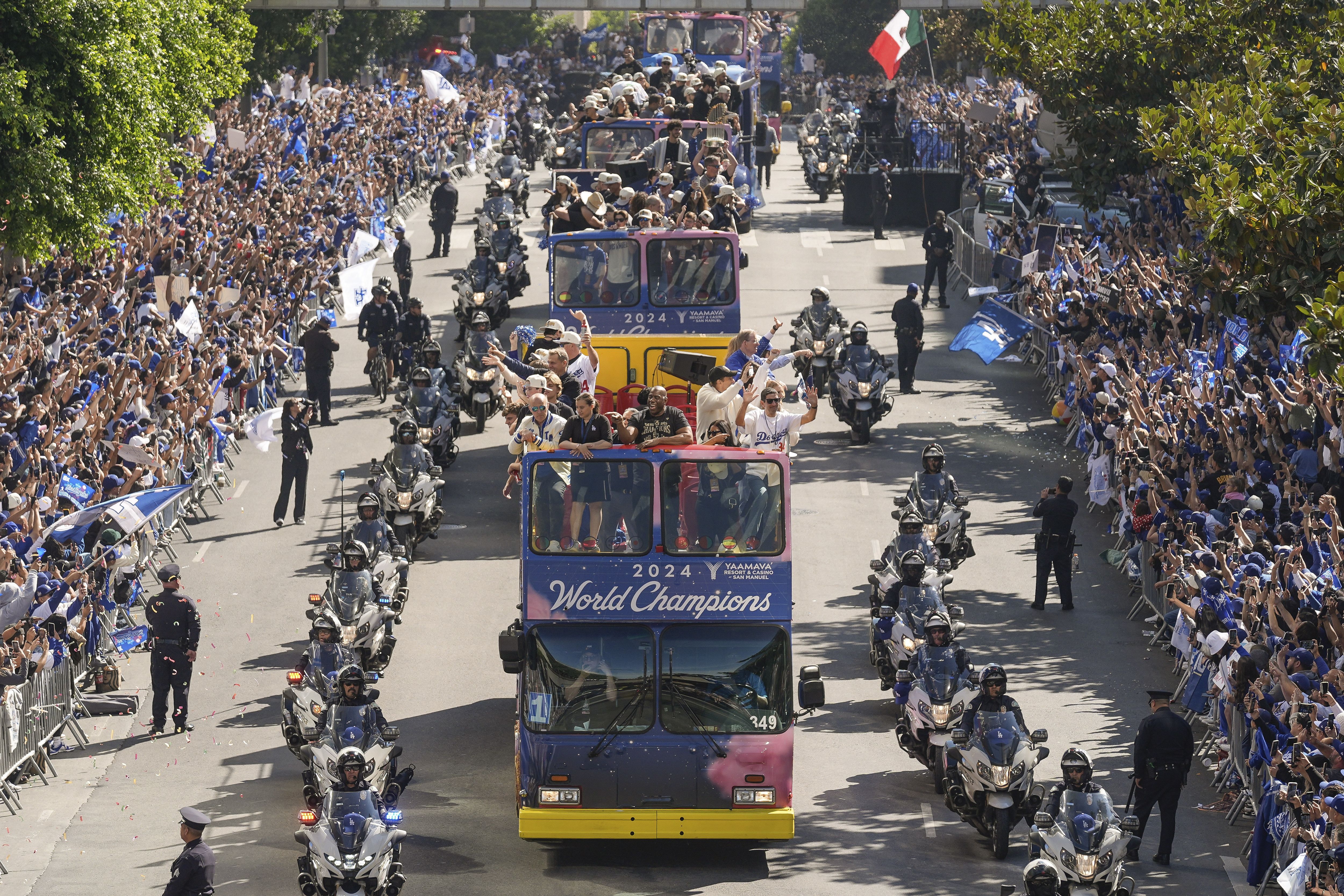 Los Angeles Dodgers players, coaches and ownership group are paraded on buses during the baseball team's World Series championship parade Friday, November 1, 2024, in Los Angeles. (Photo by Damian Dovarganes/AP Photo)