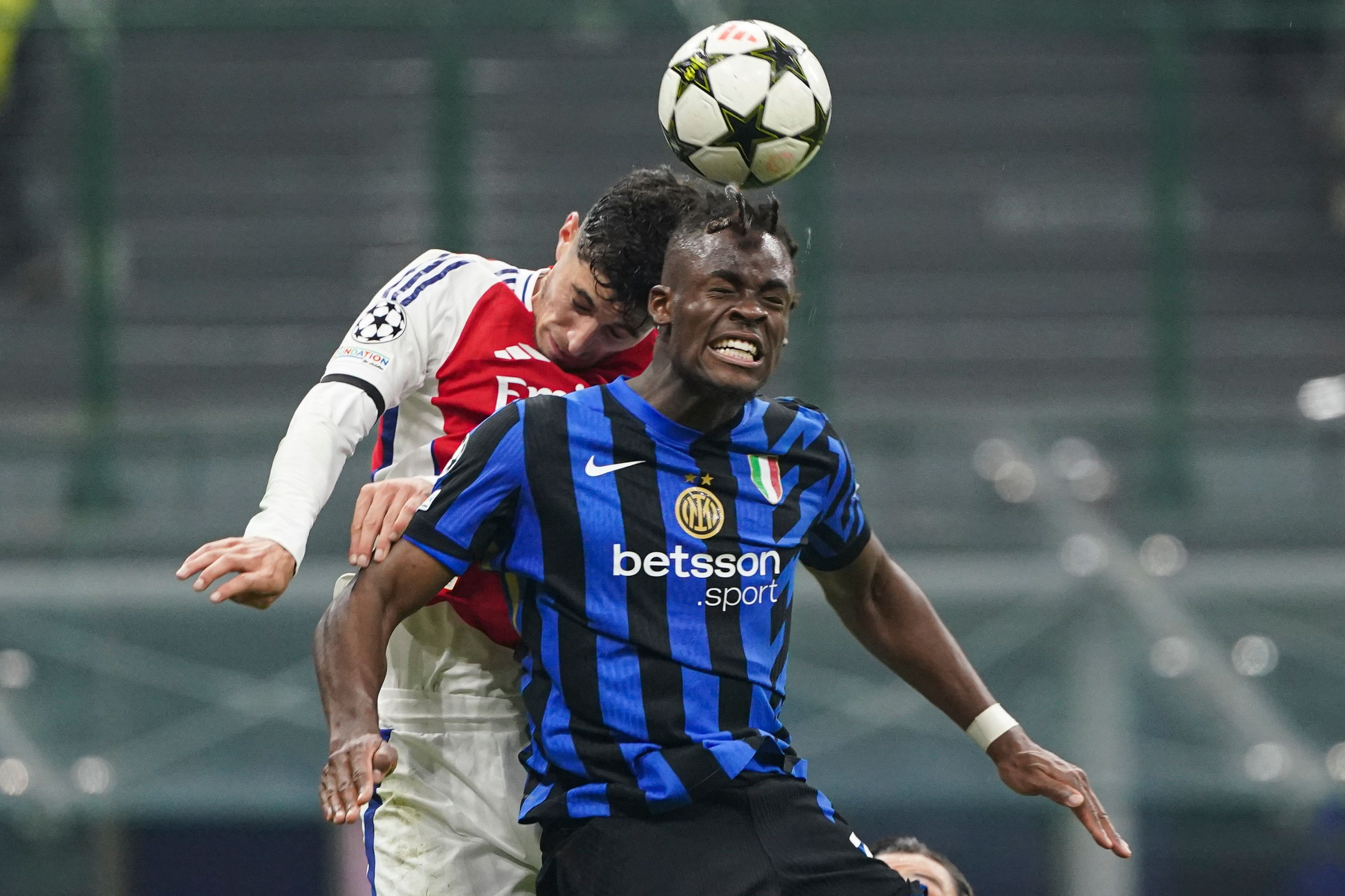 Kai Havertz of Arsenal and Yann Aurel Bisseck of Inter Milan battle for the ball during the Champions League match between Inter Milan and Arsenal at San Siro Stadium in Milan, Italy, on November 6, 2024. (Photo by RemotePhotoPress/Rex Features/Shutterstock)