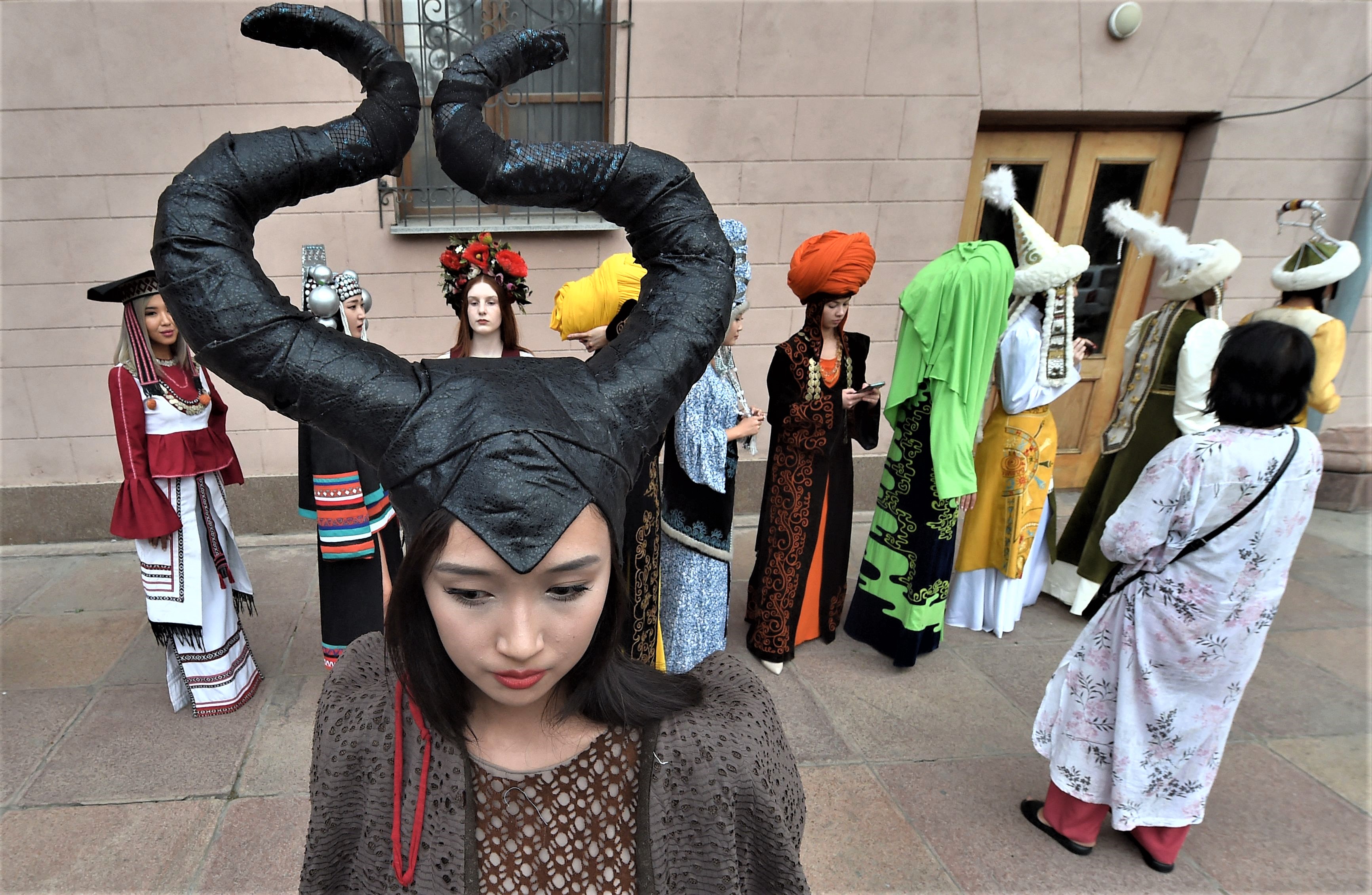 Models gather for the defile on the catwalk in front of the Opera House during the parade of models and designers during the opening of the World Nomad Fashion Festival in Bishkek on August 10, 2023. (Photo by Vyacheslav Oseledko/AFP Photo)
