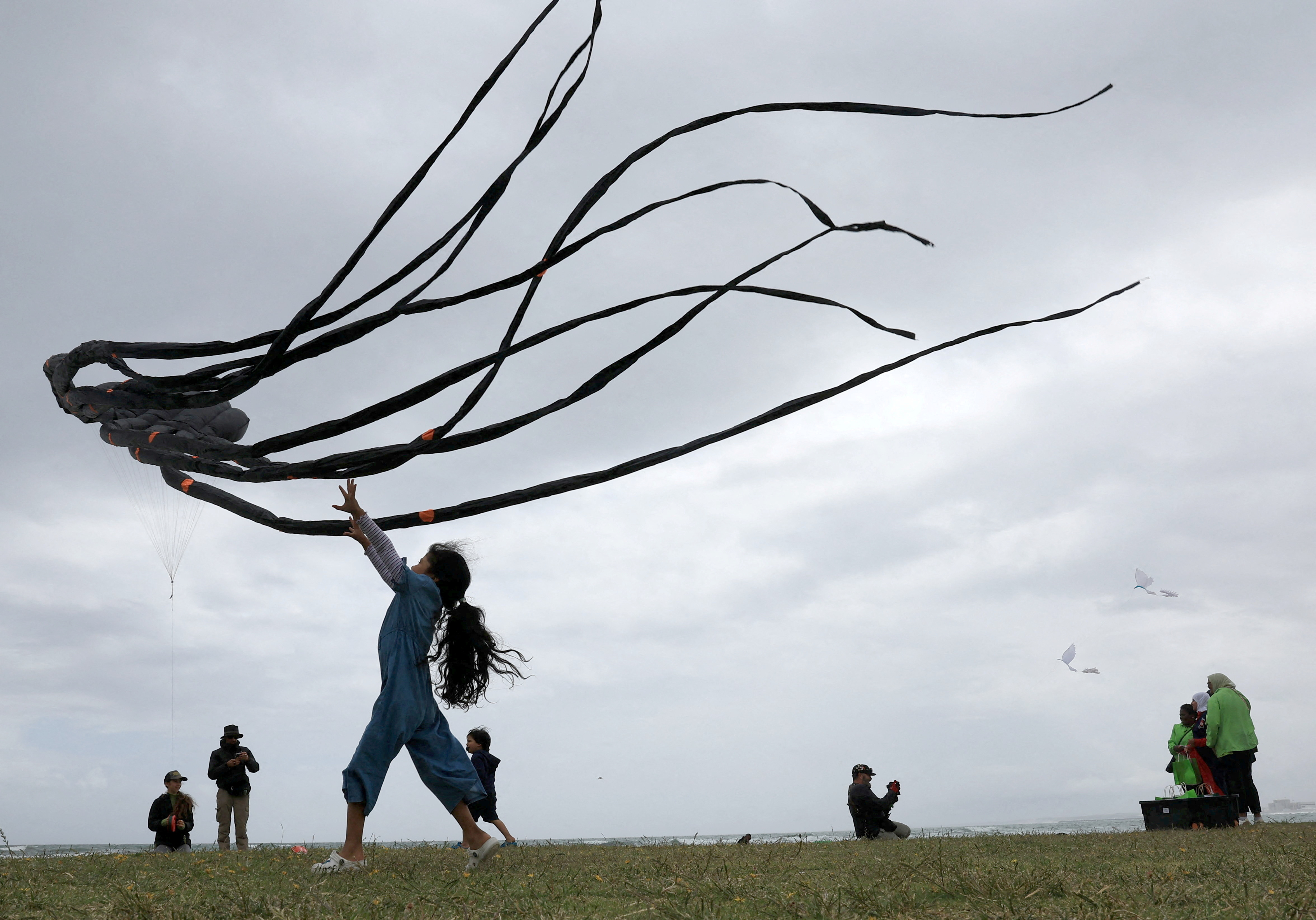A girl plays with a kite at the 30th Cape Town International Kite Festival, an awareness campaign for World Mental Health Day where kite enthusiasts gather to fly colourful kites, participate in social activities, and raise funds for Cape Mental Health at Melkbosstrand, Cape Town, South Africa, on October 27, 2024. (Photo by Esa Alexander/Reuters)