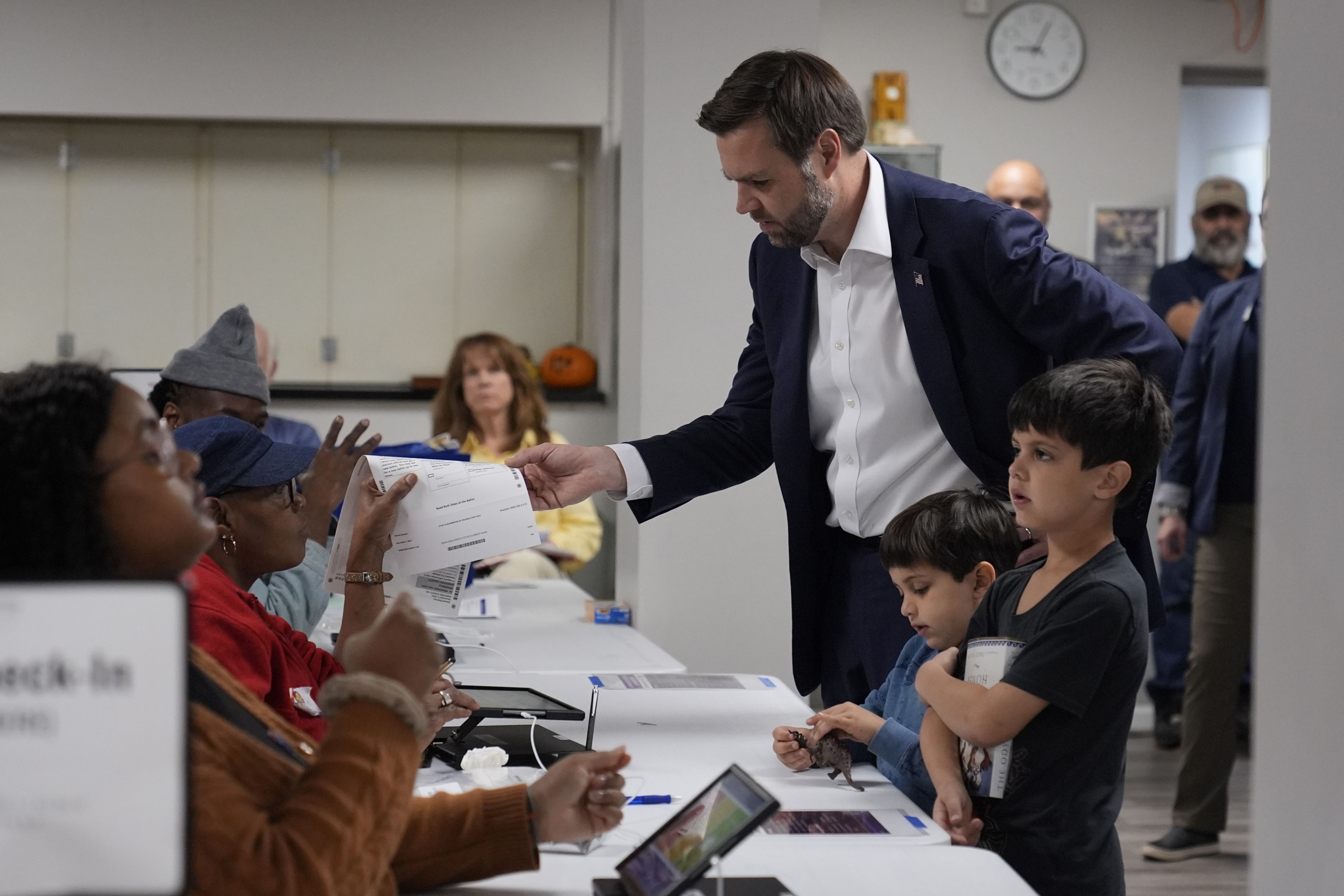 Republican vice presidential nominee Sen. JD Vance, R-Ohio, and children, arrives to vote at the St Anthony of Padua Maronite Catholic Church on election day, Tuesday, November 5, 2024, in Cincinnati. (Photo by Carolyn Kaster/AP Photo)