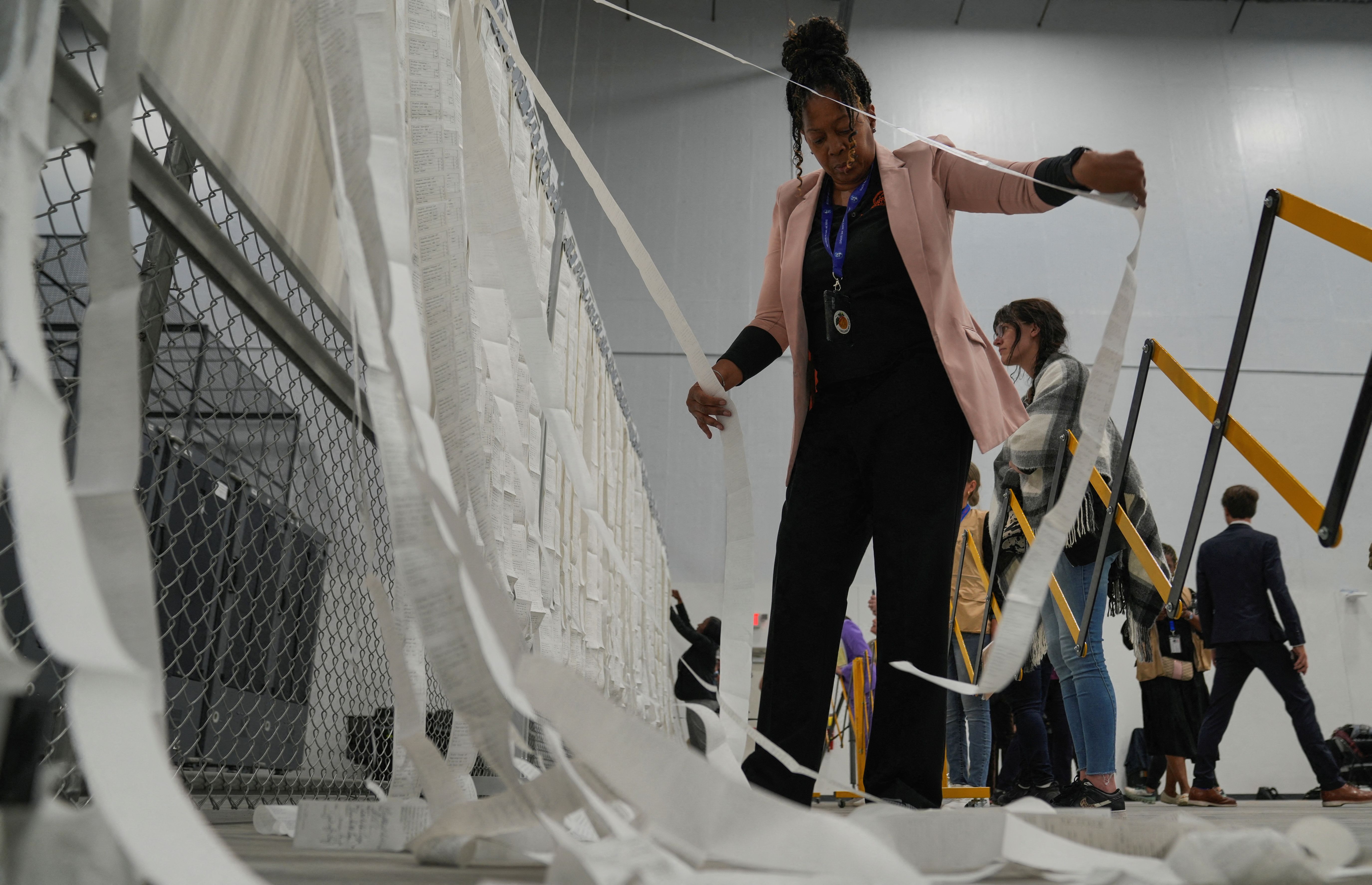 An election worker unveils early voting results at Fulton County Operations Hub and Elections Center, in Fairburn, Georgia on November 5, 2024. (Photo by Cheney Orr/Reuters)