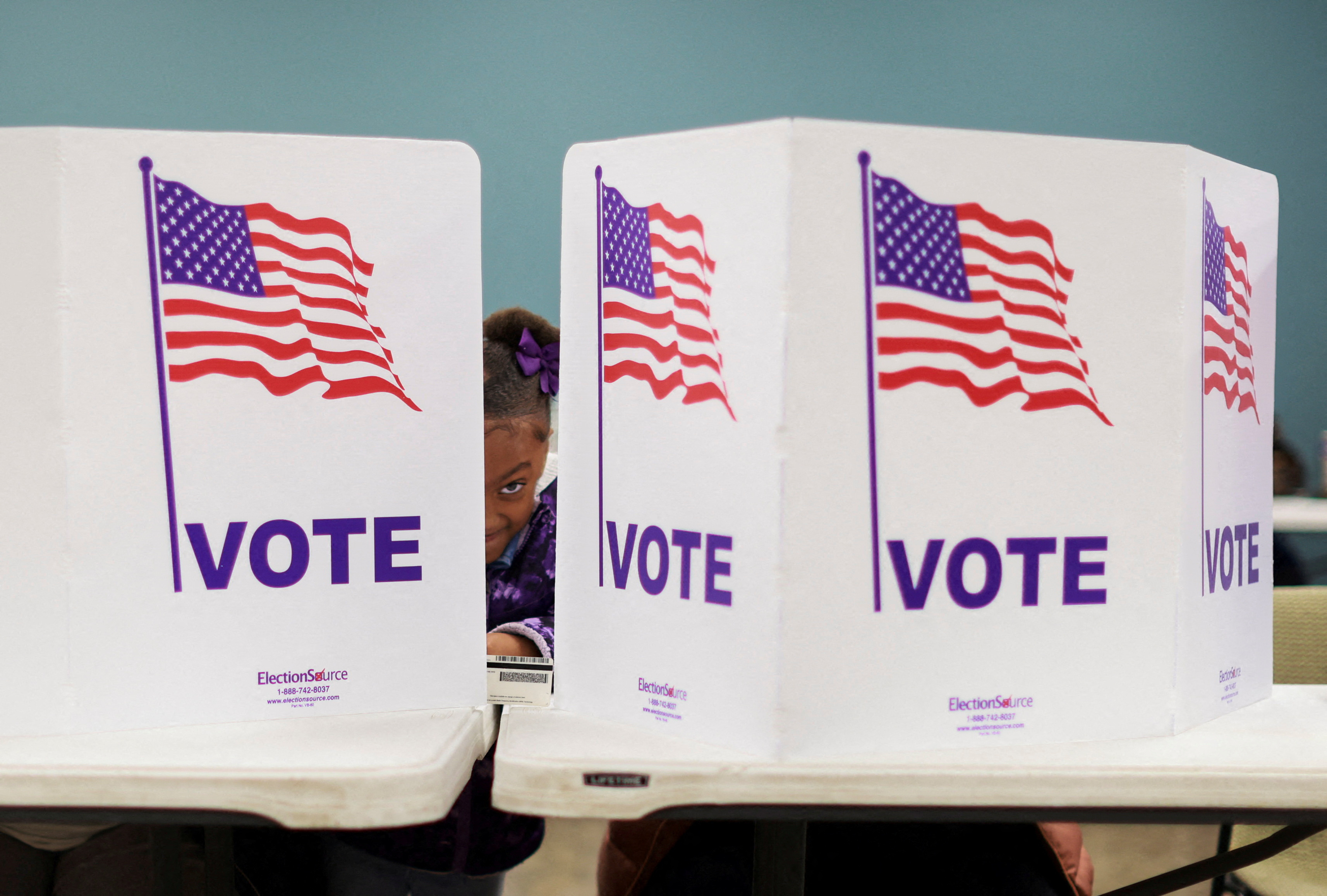 Lavish James accompanies her mother during voting in the 2024 U.S. presidential election on Election Day in First Christian Reformed Church in Grand Rapids, Michigan, U.S., November 5, 2024. (Photo by Carlos Osorio/Reuters)