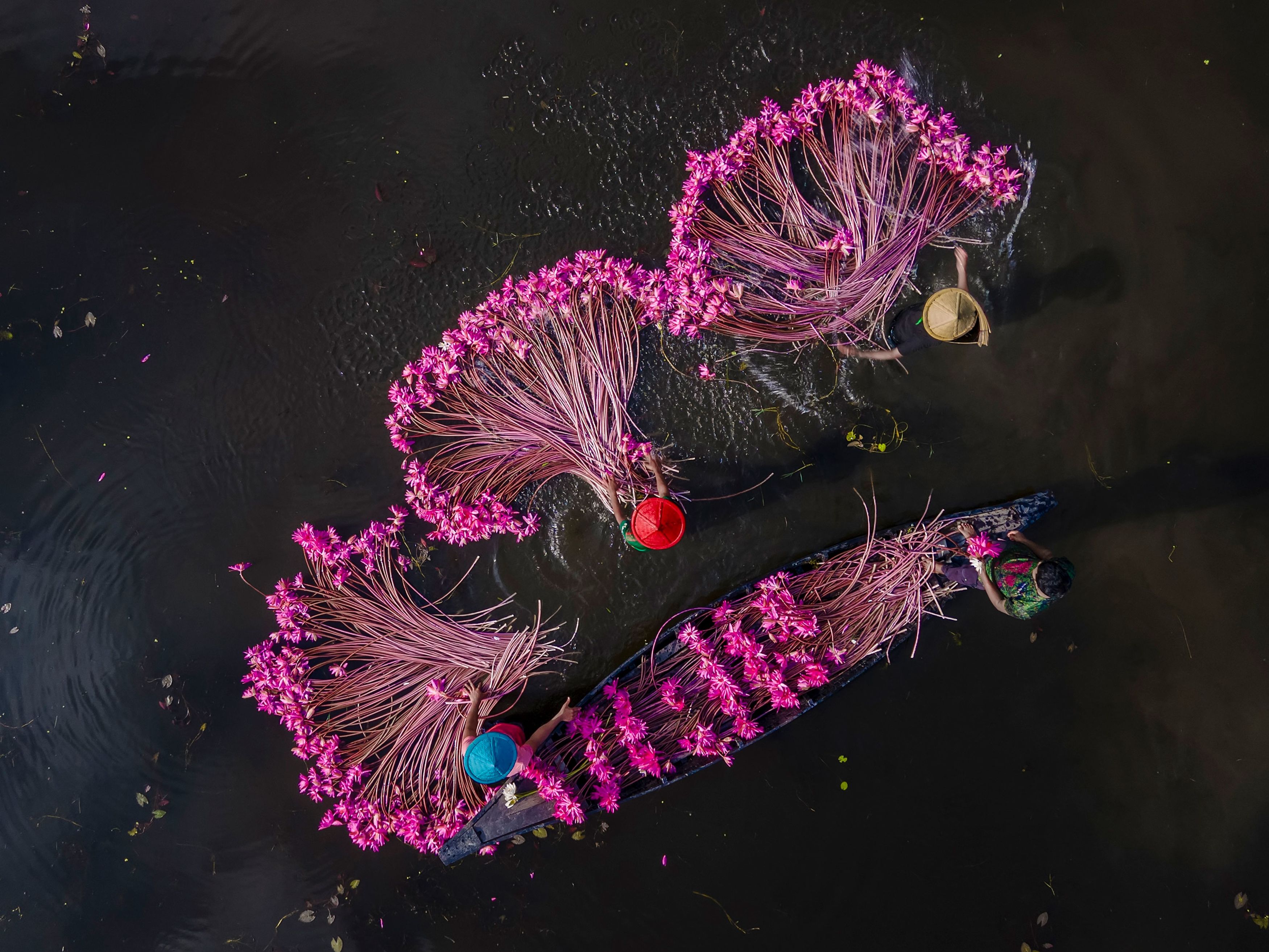 This aerial photo, taken on Sunday, September 29, 2024 shows farmers collecting water lilies in Uttar Satla, a Bangladeshi village. (Photo by Muhammad Amdad Hossain/NurPhoto/Getty Images)