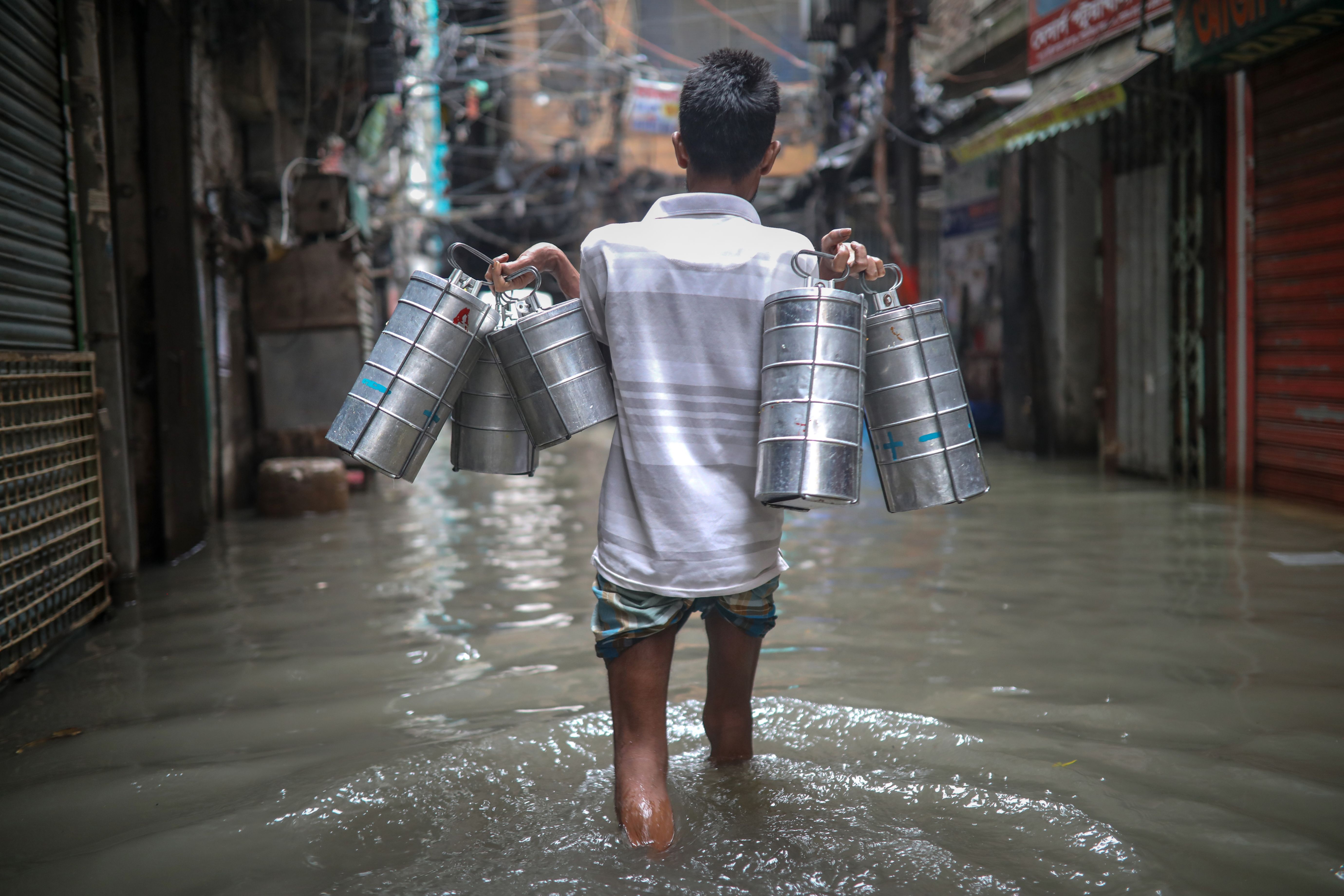 A man walks along a flooded street in the Alu Bazar area of Dhaka, Bangladesh, 03 October 2024. Heavy monsoon rains flooded parts of the capital. Bangladesh Meteorological Department (BMD) predicts rain or thundershowers for two more days across all divisions of the country, including Dhaka. (Photo by Monirul Alam/EPA/EFE)