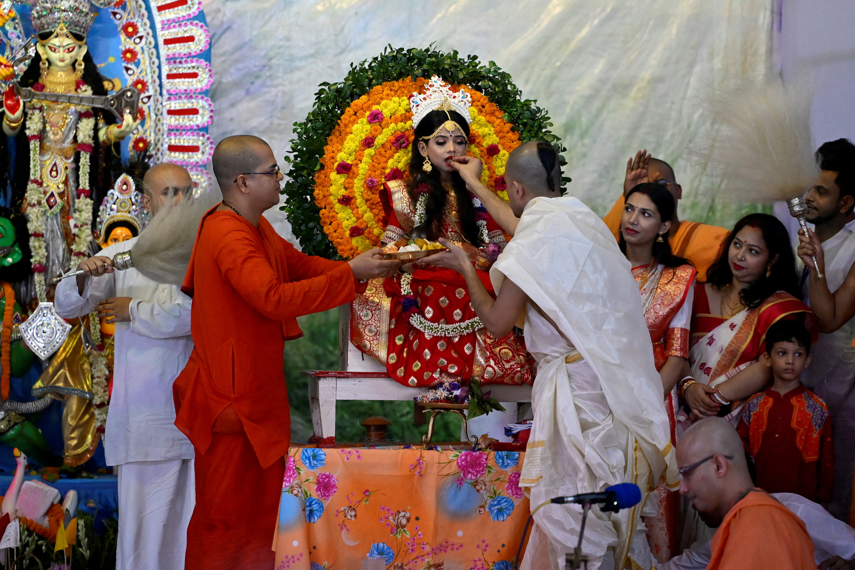 Hindu priests offer sweets to a young girl dressed as “Kumari” who is worshipped during the Durga Puja festival, at a temple in Dhaka, Bangladesh, on October 11, 2024. (Photo by Fatima Tuj Johora/Reuters)