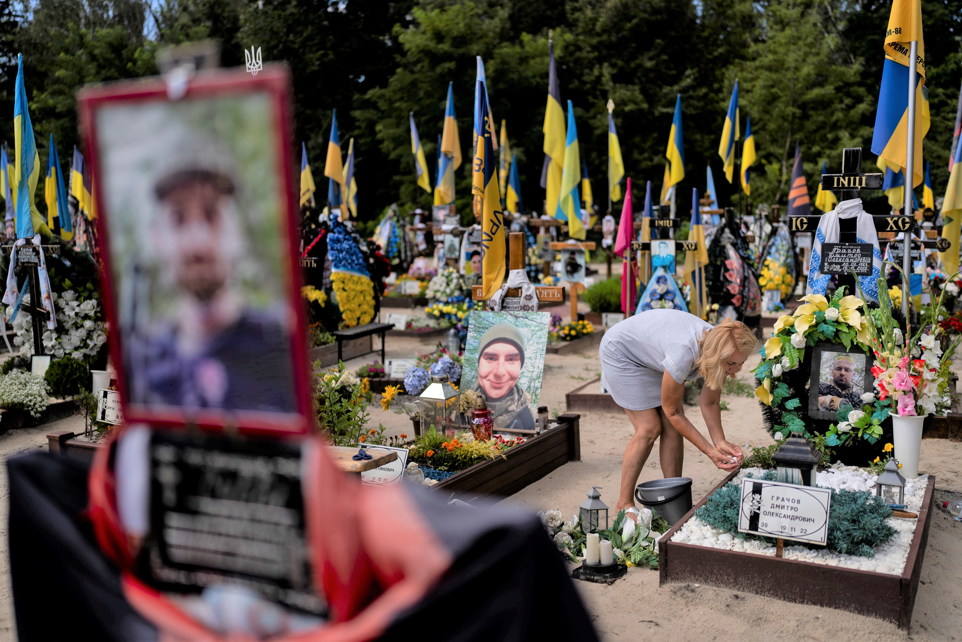 Natalie Zaichenko, 60, tends to the grave of her son, a Ukrainian soldier who was killed in the war against Russia, in Kyiv, Ukraine, Thursday, August 3, 2023. (Photo by Jae C. Hong/AP Photo)