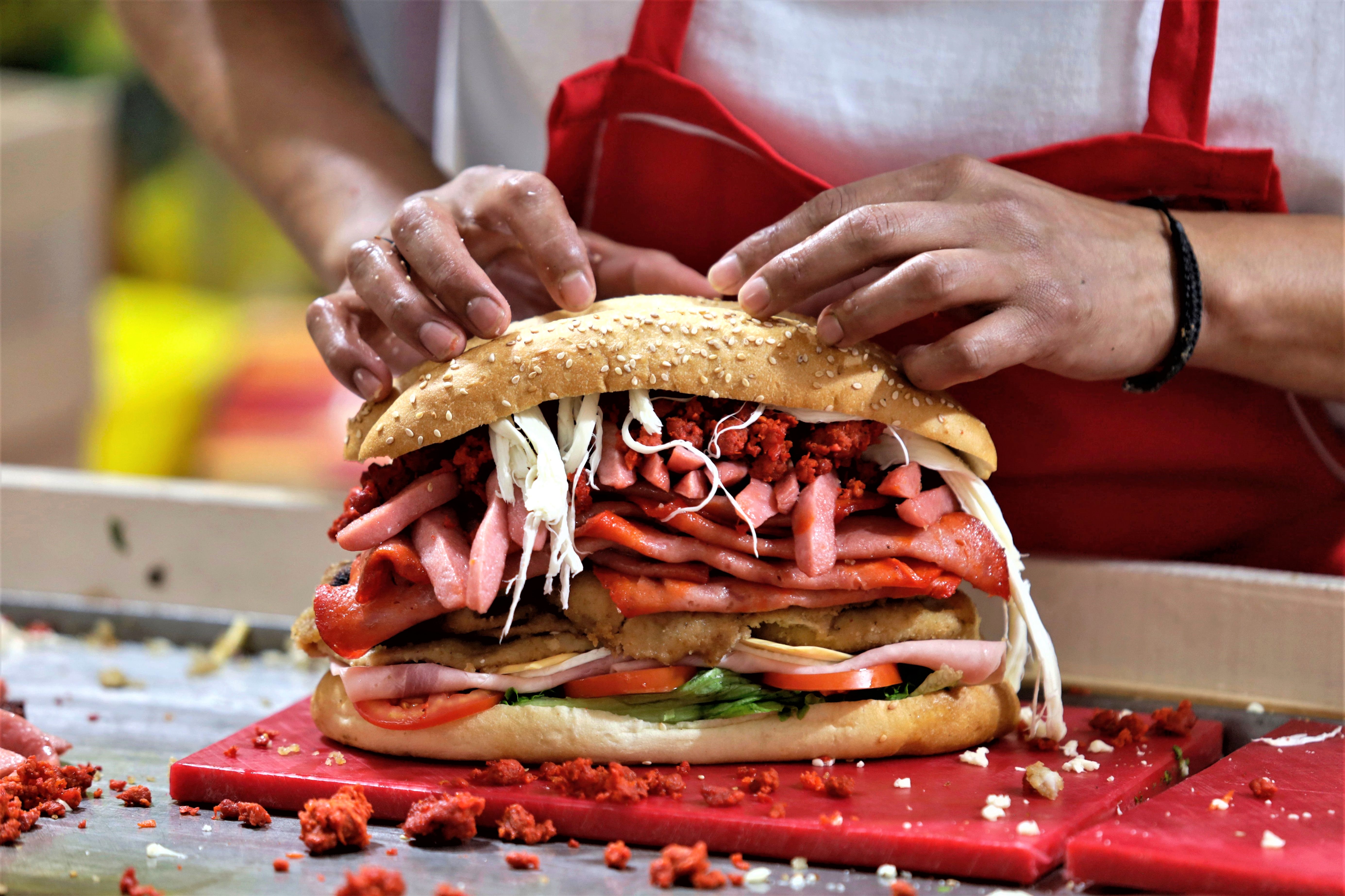 Preparation of a Cuban cake (a Mexican sandwich that is made with bread, generally a telera, bolillo or baguette, which is split in half and filled with different ingredients such as milanesa, sausages, cheese, avocado, onion, tomato, bacon, chili, chorizo, pineapple, among others), during the International Cake Fair on the esplanade of the Venustiano Carranza mayor's office in Mexico City on August 2, 2023. (Photo by Gerardo Vieyra/NurPhoto/Rex Features/Shutterstock)