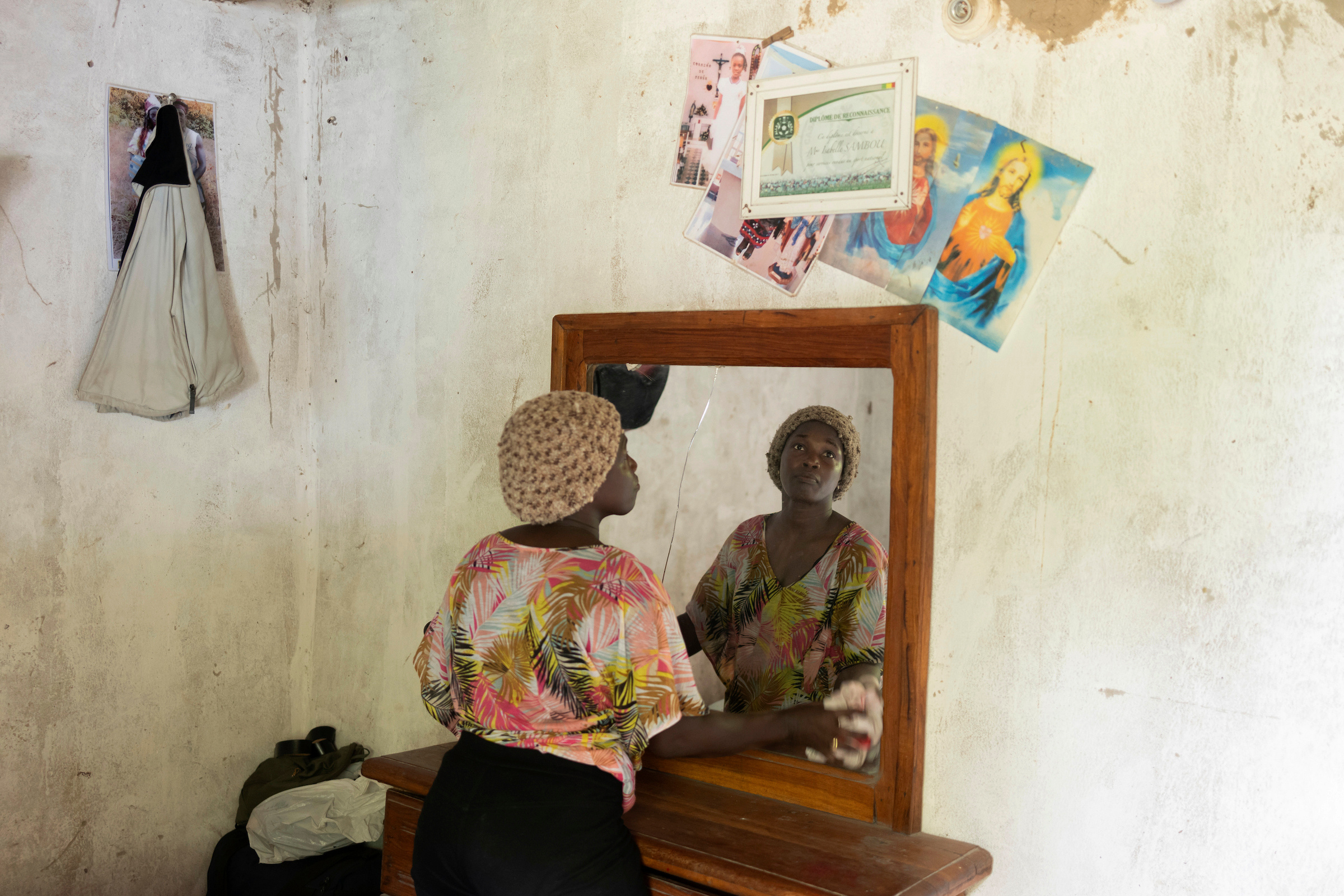 Coach Isabelle Sambou, 43 years old, two-time Olympian and nine-time African wrestling champion, cleans a mirror inside her room in Mlomp, southern Senegal, Wednesday, July 10, 2024. (Photo by Sylvain Cherkaoui/AP Photo)