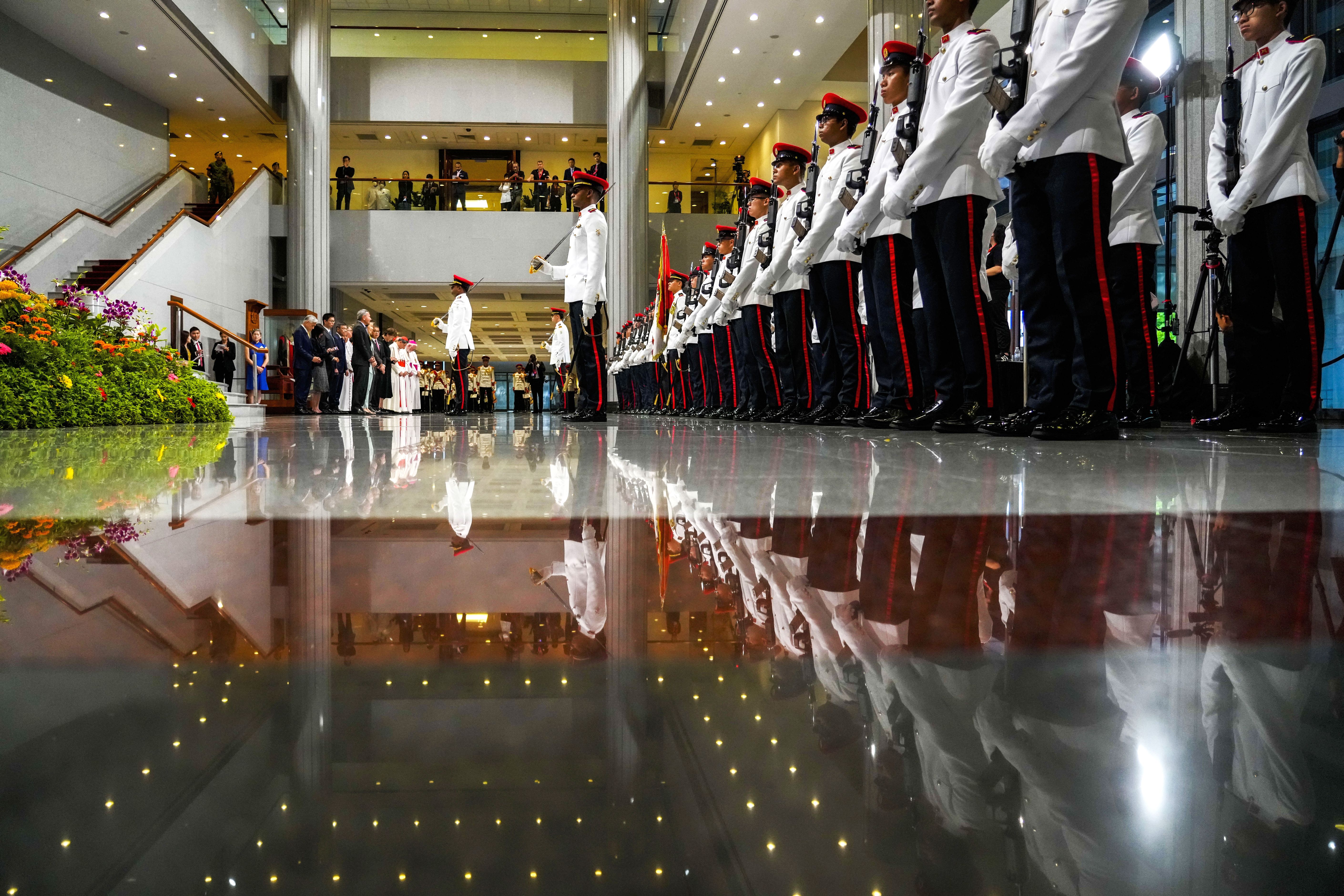 The President of the Singapore Republic Tharman Shanmugaratnam with Minister of Culture, Community and Youth Edwin Tong, the Ambassador of Singapore to the Holy See Ang Janet Guat Har and other authorities wait for Pope Francis at the Parliament House in Singapore, Thursday, September 12, 2024. Pope Francis flew to Singapore on Wednesday for the final leg of his trip through Asia, arriving in one of the world's richest countries from one of its poorest after a record-setting final Mass in East Timor. (Photo by Gregorio Borgia/AP Photo)