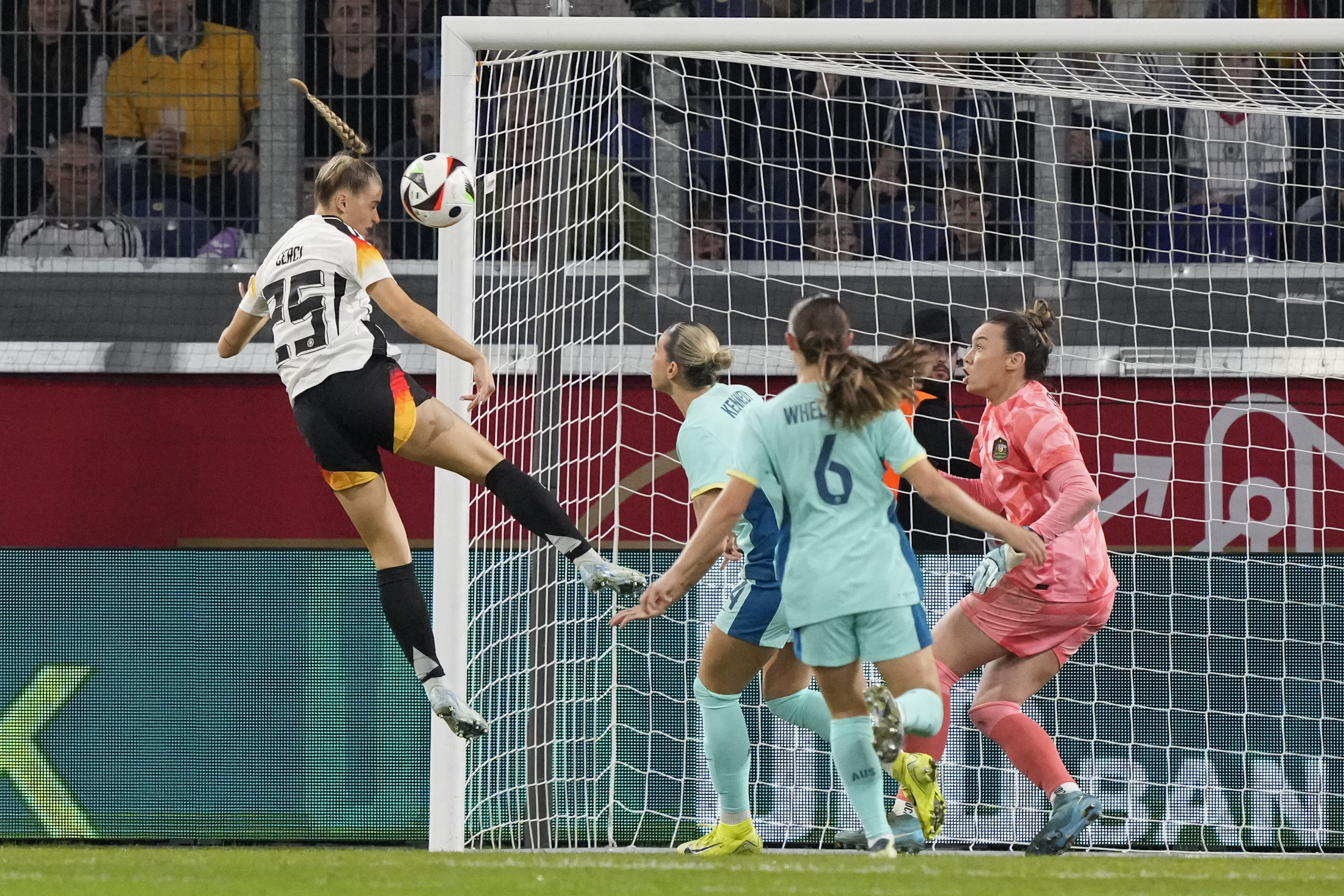 Germany's Selina Cerci scores the opening goal against Australia's goalkeeper Mackenzie Arnold during the international women's friendly soccer match between Germany and Australia in Duisburg, Germany, Monday, October 28, 2024. (Photo by Martin Meissner/AP Photo)