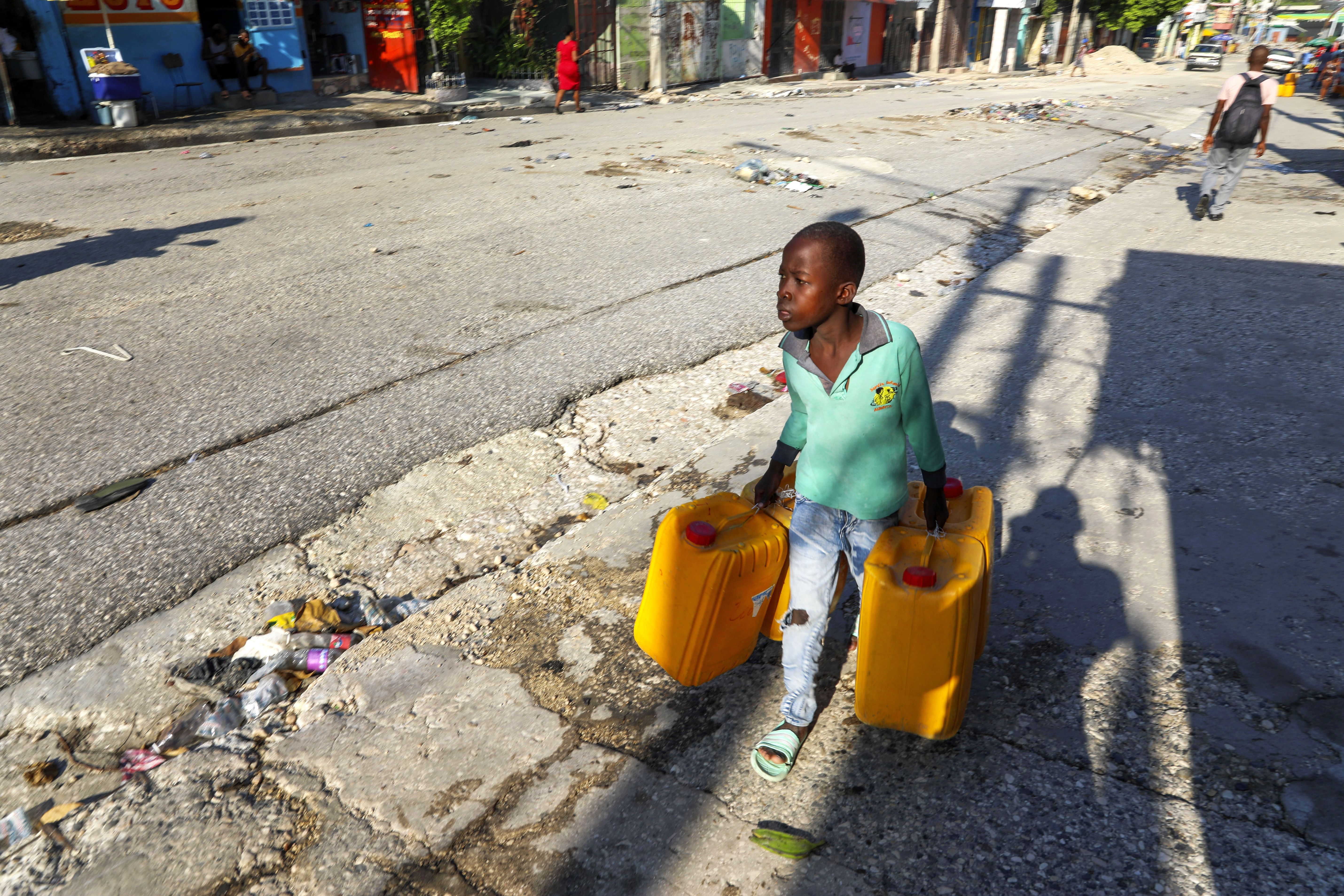 A youth carries empty containers as fetches drinking water in Port-au-Prince, Haiti, Tuesday, October 1, 2024. (Photo by Odelyn Joseph/AP Photo)