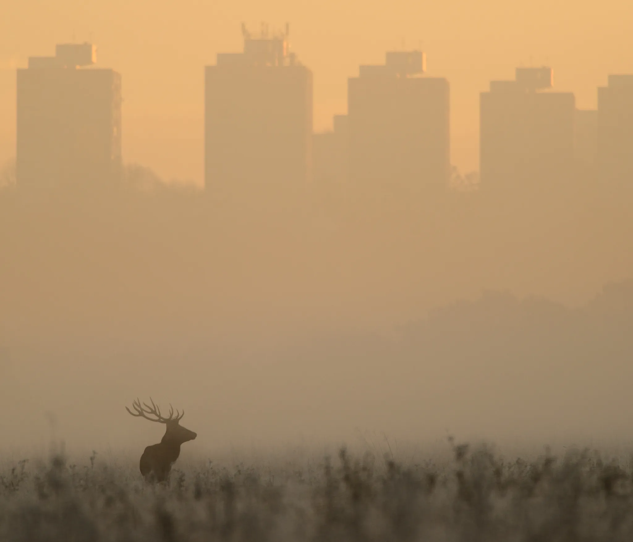 J) Highly commended – Richard Fisher. Story: I had rented a camera for the weekend to photograph a friend's wedding, and so had planned to get my moneys worth by visiting Richmond Park that Sunday morning long before knowing what the weather conditions were likely to be. I traveled with a friend and luck was on our side. We were treated with tall frozen grass and dense fog that lit up golden as the sun rose in to a cloudless sky. As a herd of red deer made they way into a wooded area this stag and two females hung back for a few minutes. Richmond Park is large enough to compose shots that hide any trace of human presence, however this is my favourite shot of the morning: the stag stood facing into the sun mirrored in the tower blocks on the distant hill, their television antennae mirroring his antlers.