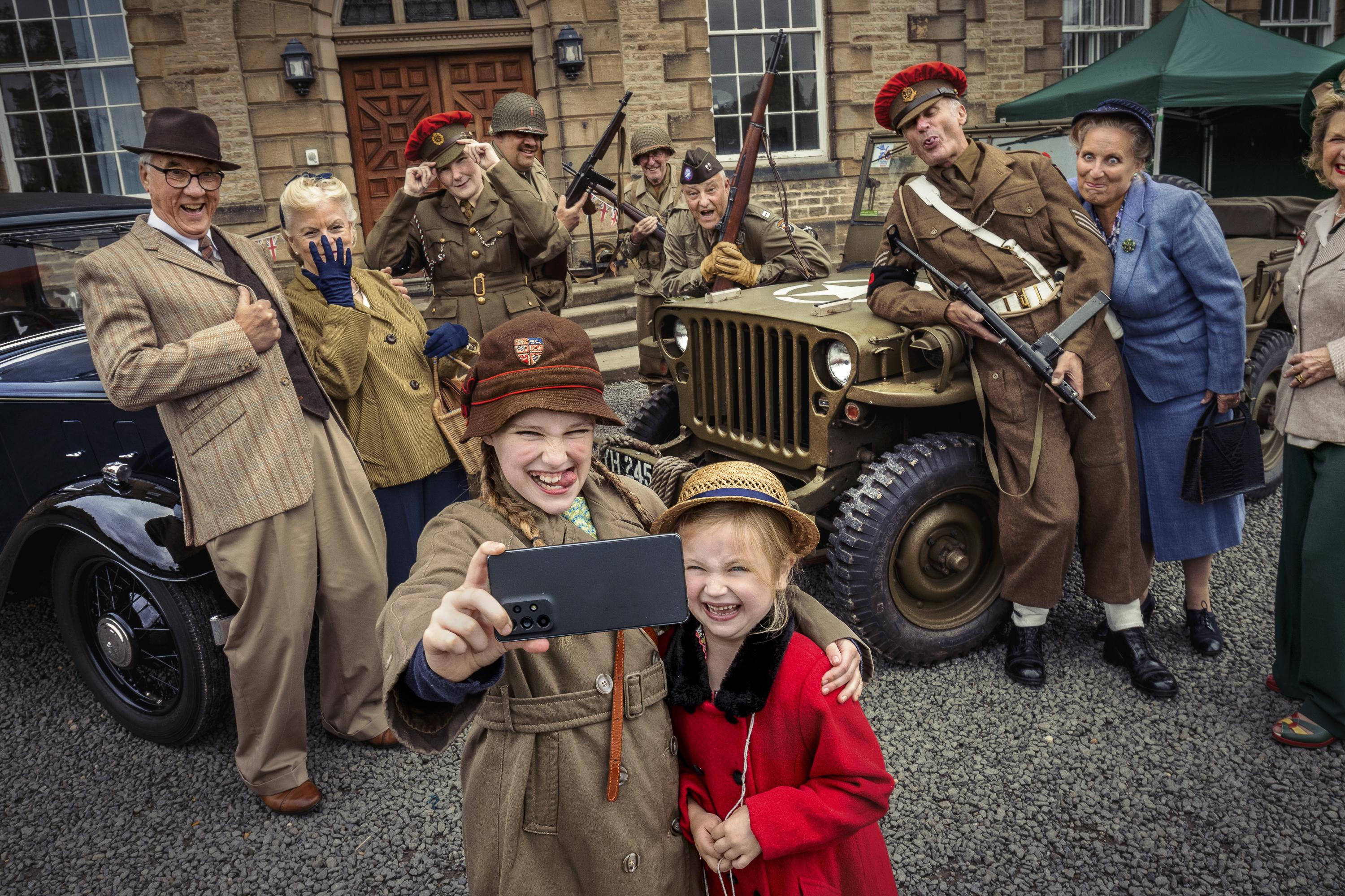 Historical re-enactment enthusiasts, including Tabitha and Penelope Airey, nine and five, pose for a selfie ahead of the Way Back When: 1940s Weekend held at Ushaw Historic House, County Durham, UK on August 4, 2023. (Photo by James Glossop/The Times)