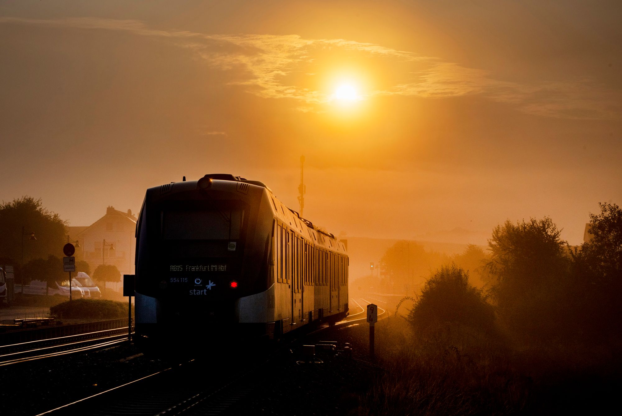 A regional train approaches the station in Wehrheim near Frankfurt, Germany, as the sun rises on a foggy morning, Tuesday, September 3, 2024. (Photo by Michael Probst/AP Photo)