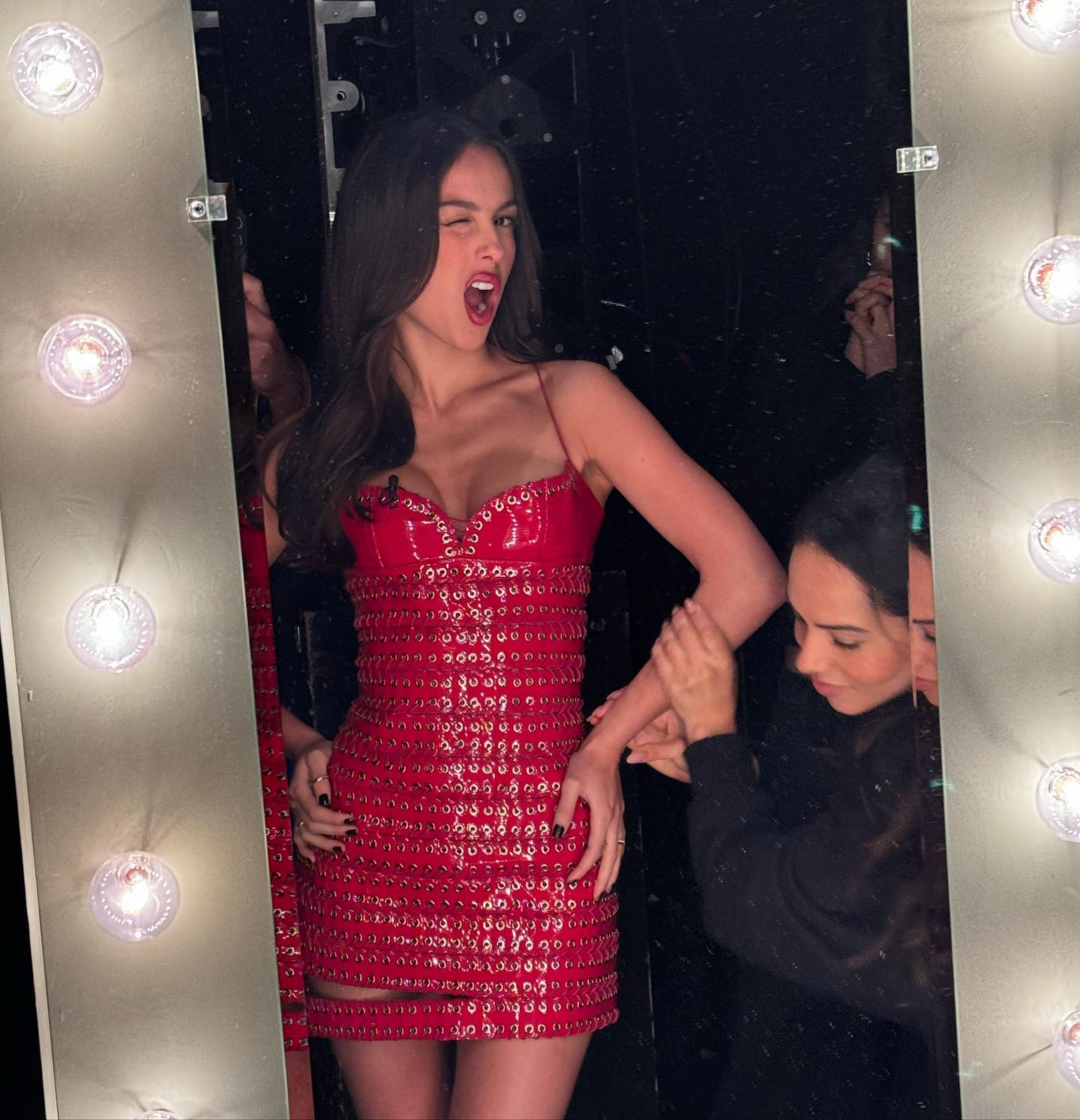 American singer-songwriter Olivia Rodrigo looks radiating in red while backstage at “The Tonight Show Starring Jimmy Fallon” in the last decade of October 2024. (Photo by oliviarodrigo/Instagram)