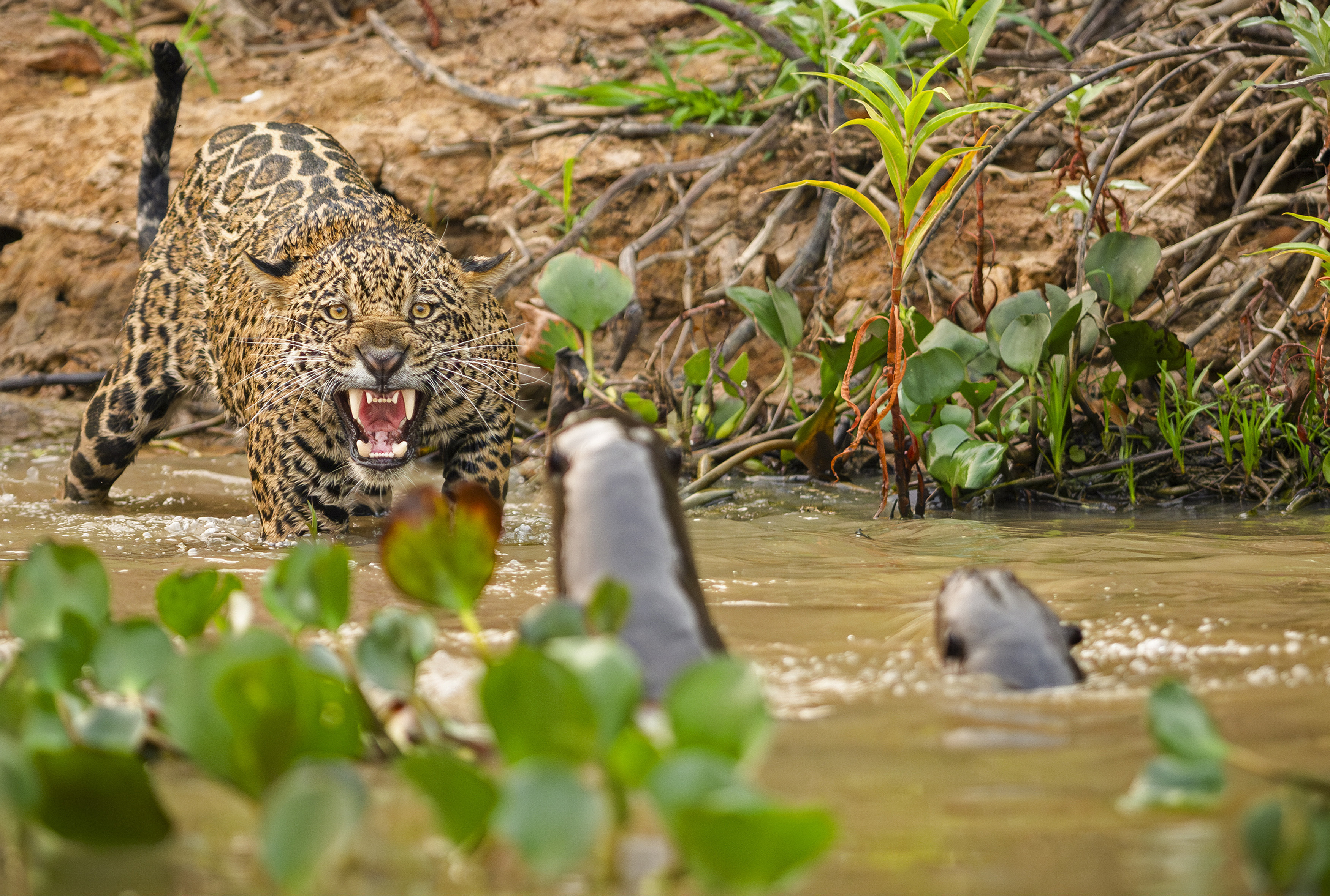 A jaguar eyes up a group of otters from a riverbank in Porto Jofre, North Pantanal, Brazil early November 2024. (Photo by Octavio Campos Salles/Solent News)