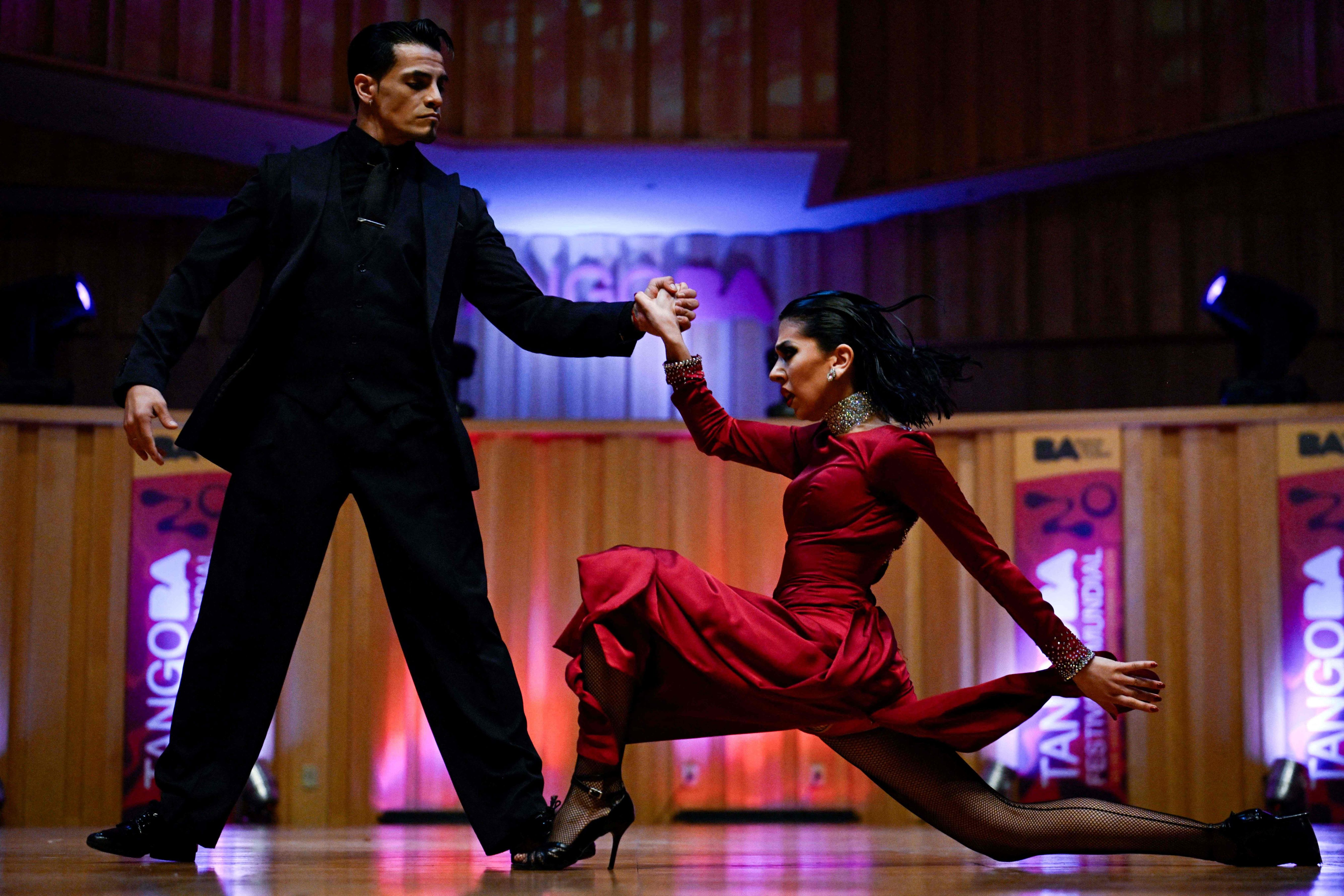 Ayelen Morando (R) and Sebastian Martinez compete during the World Tango Championship semifinal in the Tango Stage category in Buenos Aires on August 31, 2023. The Tango World Festival and Championship, which brings together thousands of Tango music lovers from different parts of the world every year, is being held in the Argentine capital Buenos Aires and runs until September 3. (Photo by Luis Robayo/AFP Photo)