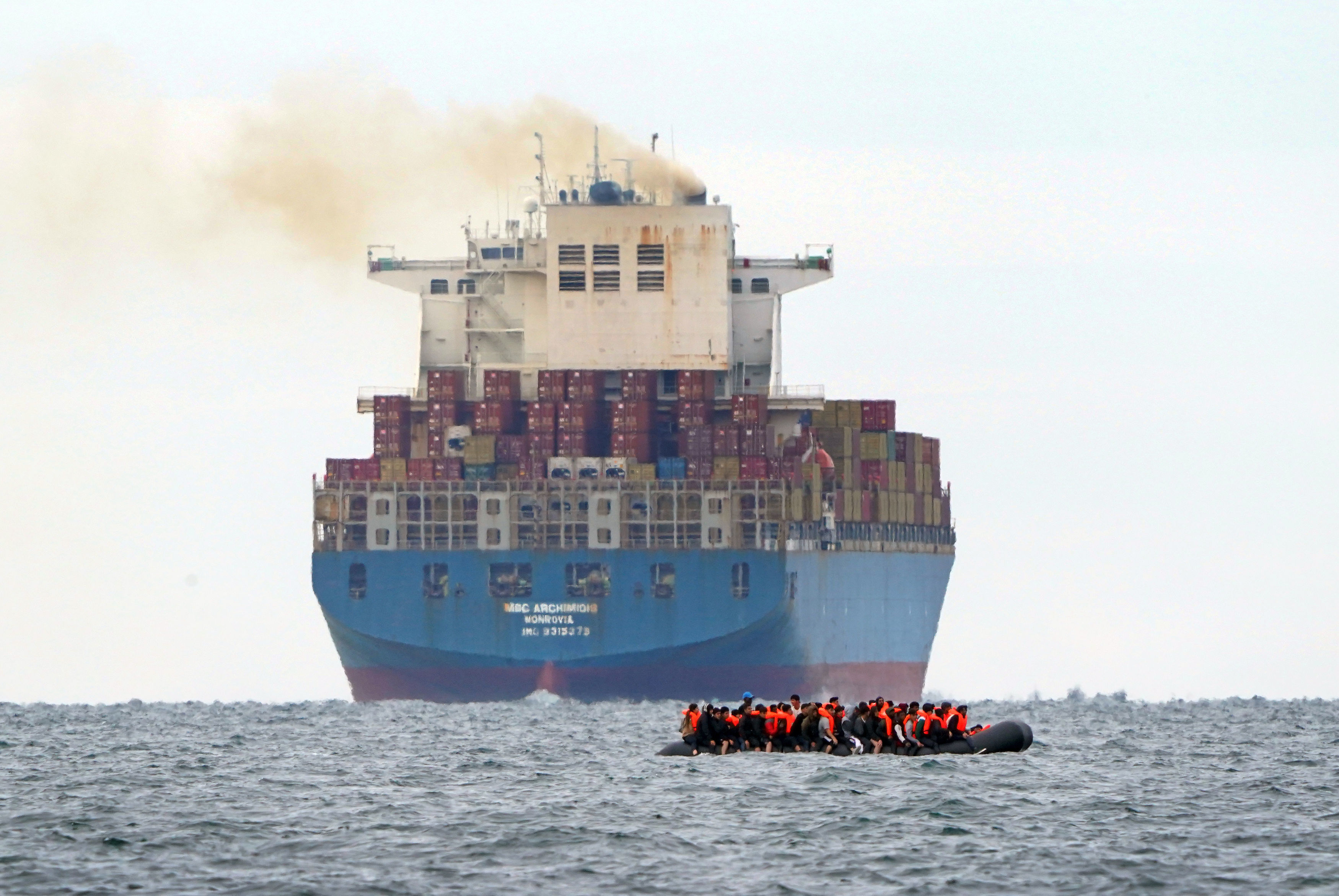 A group of people thought to be migrants crossing the Channel in a small boat traveling from the coast of France and heading in the direction of Dover, Kent on Tuesday, August 29, 2023. (Photo by Gareth Fuller/PA Images via Getty Images)