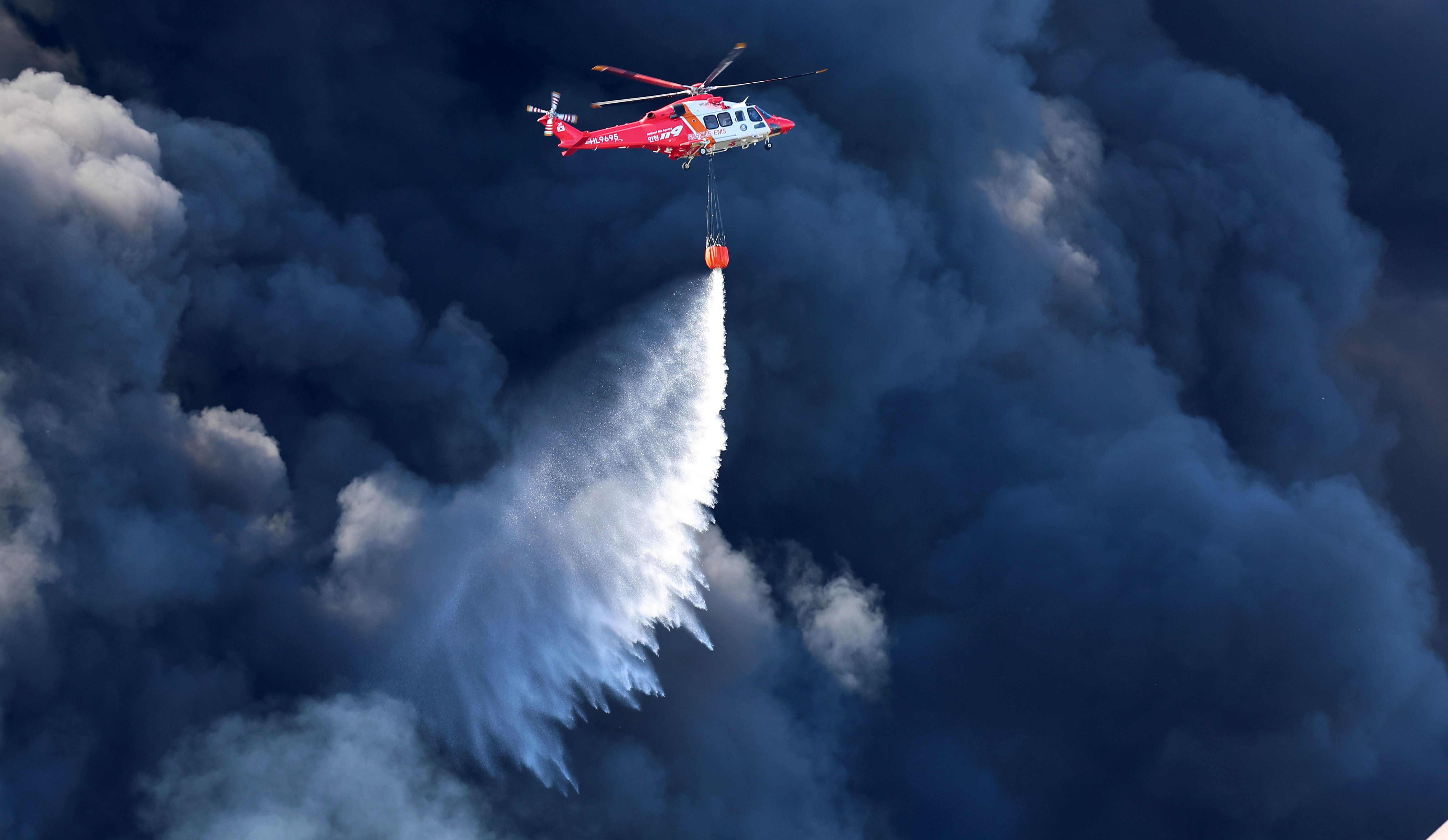 A firefighting helicopter extinguishes a fire at a factory in Incheon, South Korea, 20 October 2024. (Photo by Yonhap/EPA/EFE)