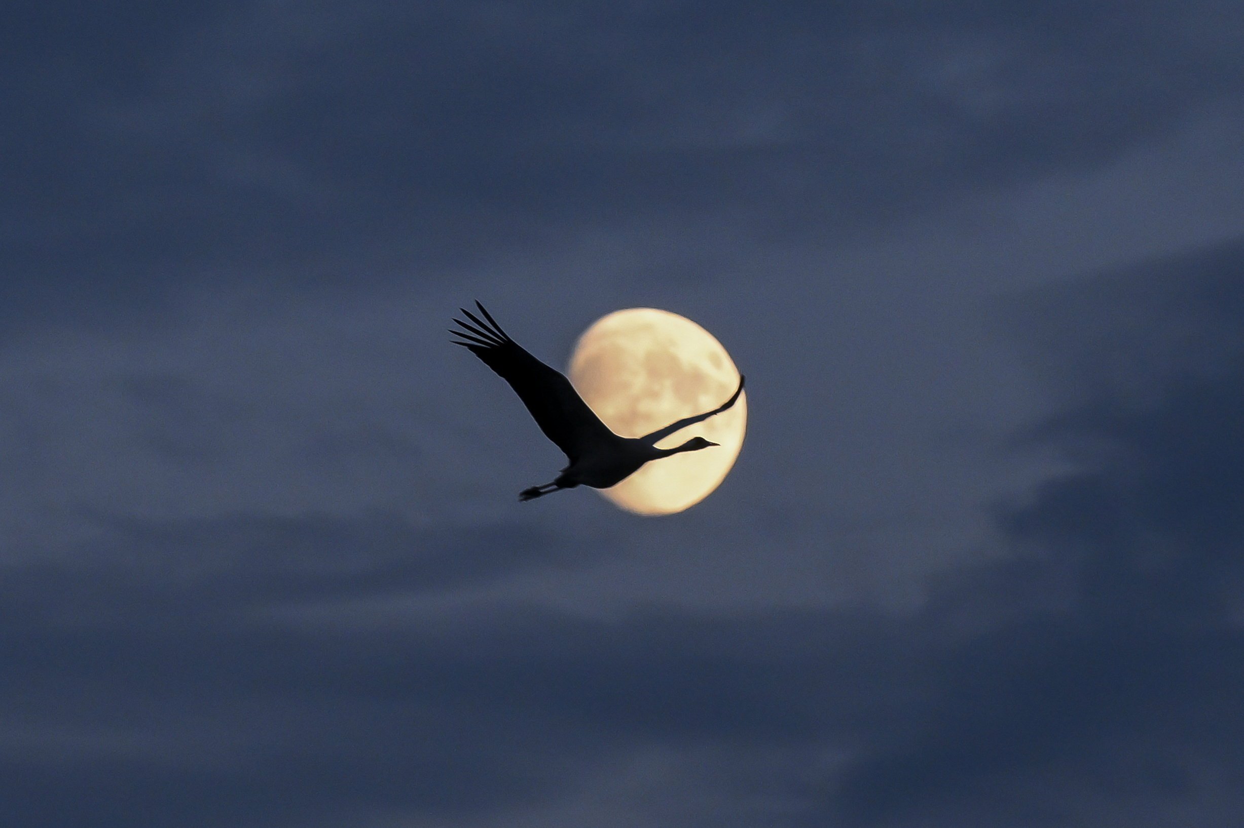 A common crane (Grus grus) flies above the Eastern reservoir at sunset near Balmazujvaros, eastern Hungary, 14 October 2024. (Photo by Zsolt Czegledi/EPA/EFE)