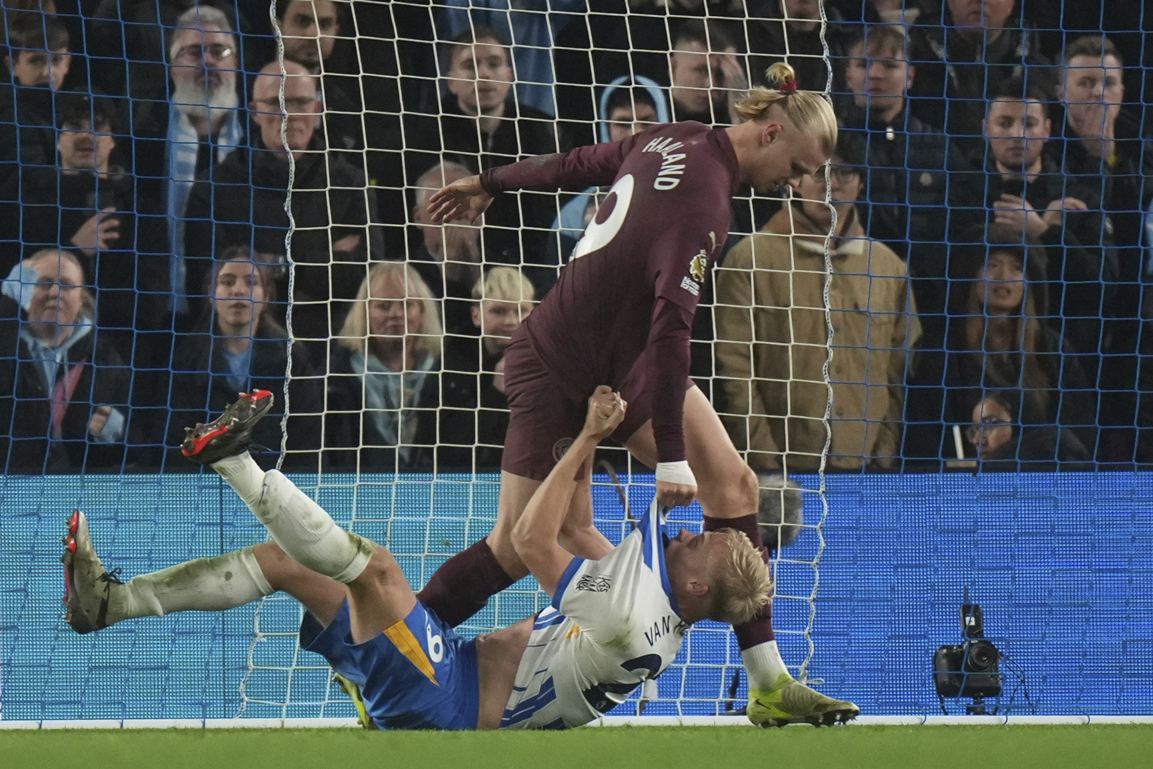 Manchester City's Erling Haaland grabs Brighton's Jan Paul van Hecke during the English Premier League soccer match between Brighton and Manchester City at Falmer Stadium in Brighton, England, Saturday, November 9, 2024. (Photo by Alastair Grant/AP Photo)
