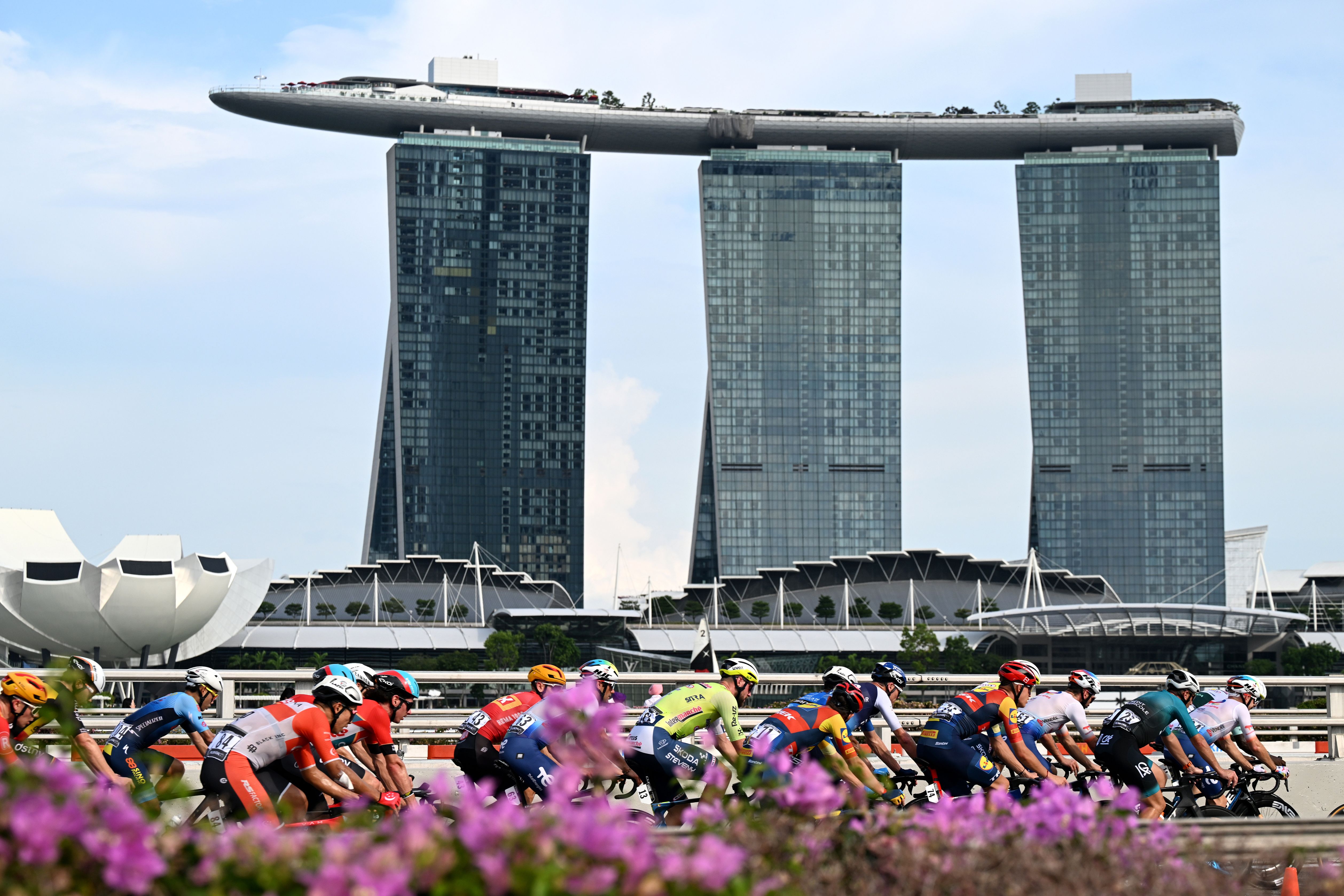 (L-R) Fabien Grellier of France and Team TotalEnergies, Laurent Rex of Belgium and Team Intermarche-Circus-Wanty, Patrick Konrad of Austria and Team Lidl - Trek and a general view of the peloton competing with the Marina Bay Sands building in the background during the 3rd Tour de France Prudential Singapore 2024 - Criterium a 57.5km one day race from Singapore to Singapore on November 10, 2024 in Singapore. (Photo by Tim de Waele/Getty Images)
