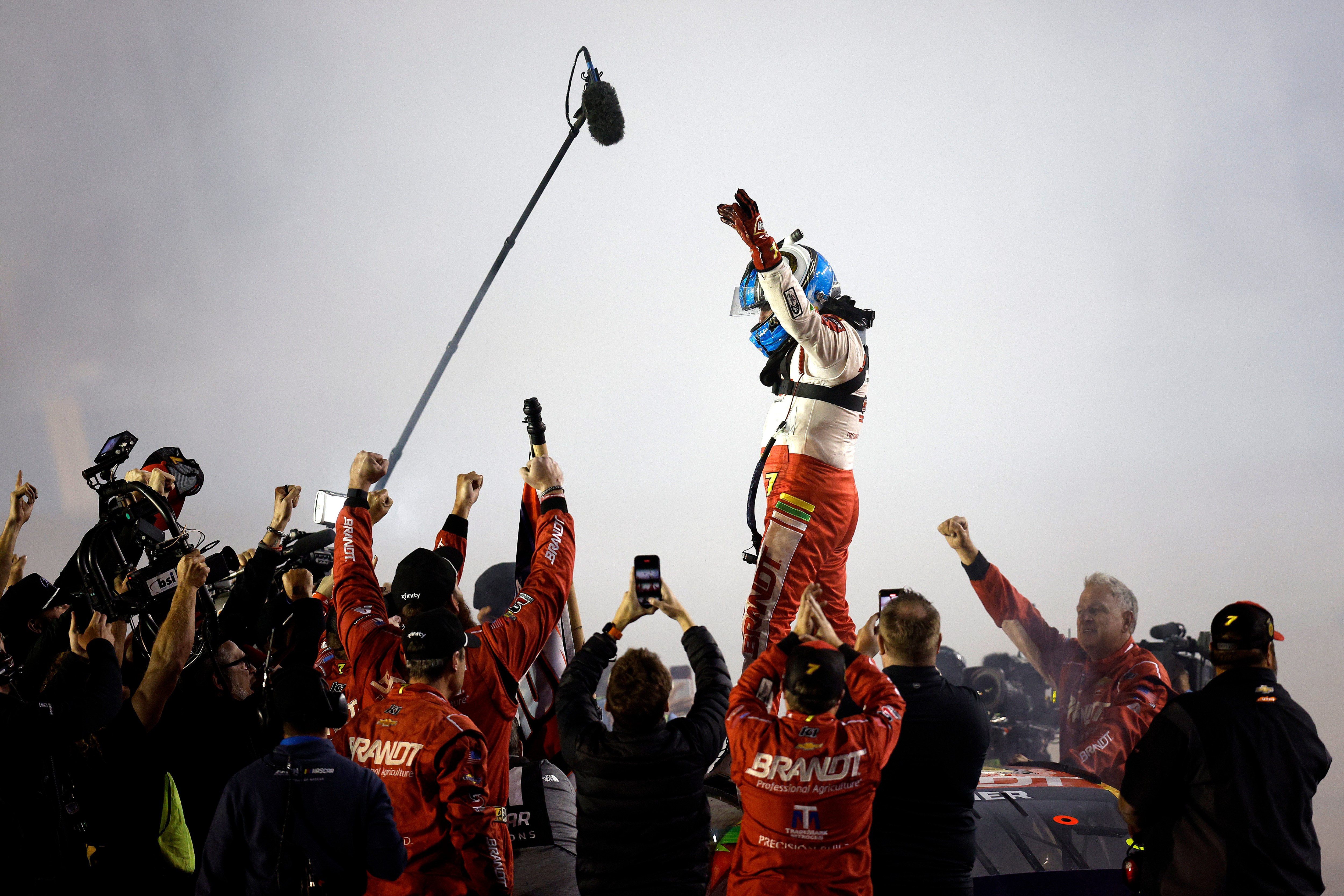Justin Allgaier, driver of the #7 BRANDT Chevrolet, celebrates after winning the 2024 NASCAR Xfinity Series Championship in the NASCAR Xfinity Series Championship Race at Phoenix Raceway on November 09, 2024 in Avondale, Arizona. (Photo by Sean Gardner/Getty Images)