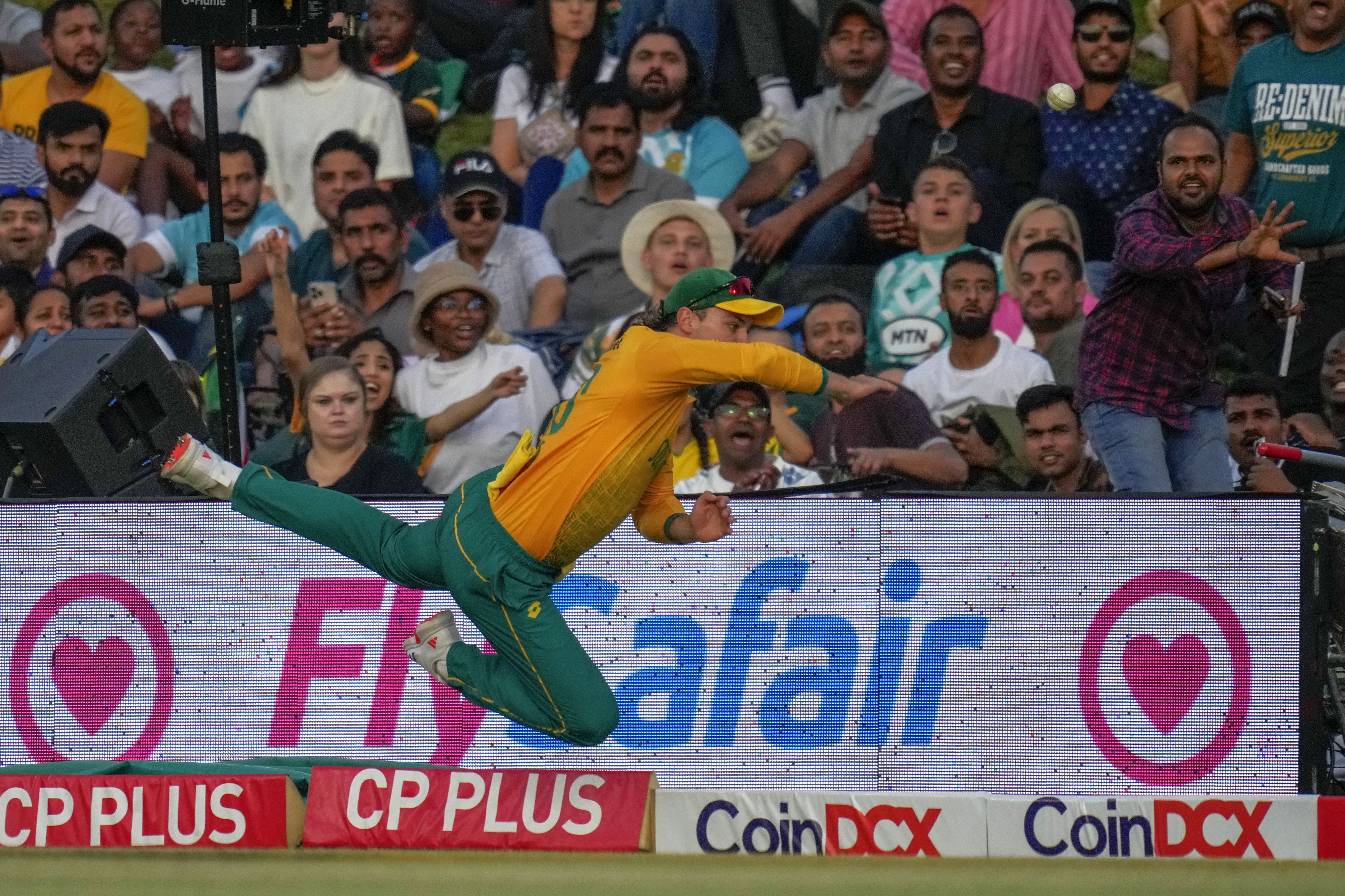 South Africa's Tristan Stubbs jumps as he tries to catch a ball at the boundary during the third T20 International cricket match between South Africa and India, at Centurion Park in Centurion, South Africa, Wednesday, November 13, 2024. (Photo by Themba Hadebe/AP Photo)