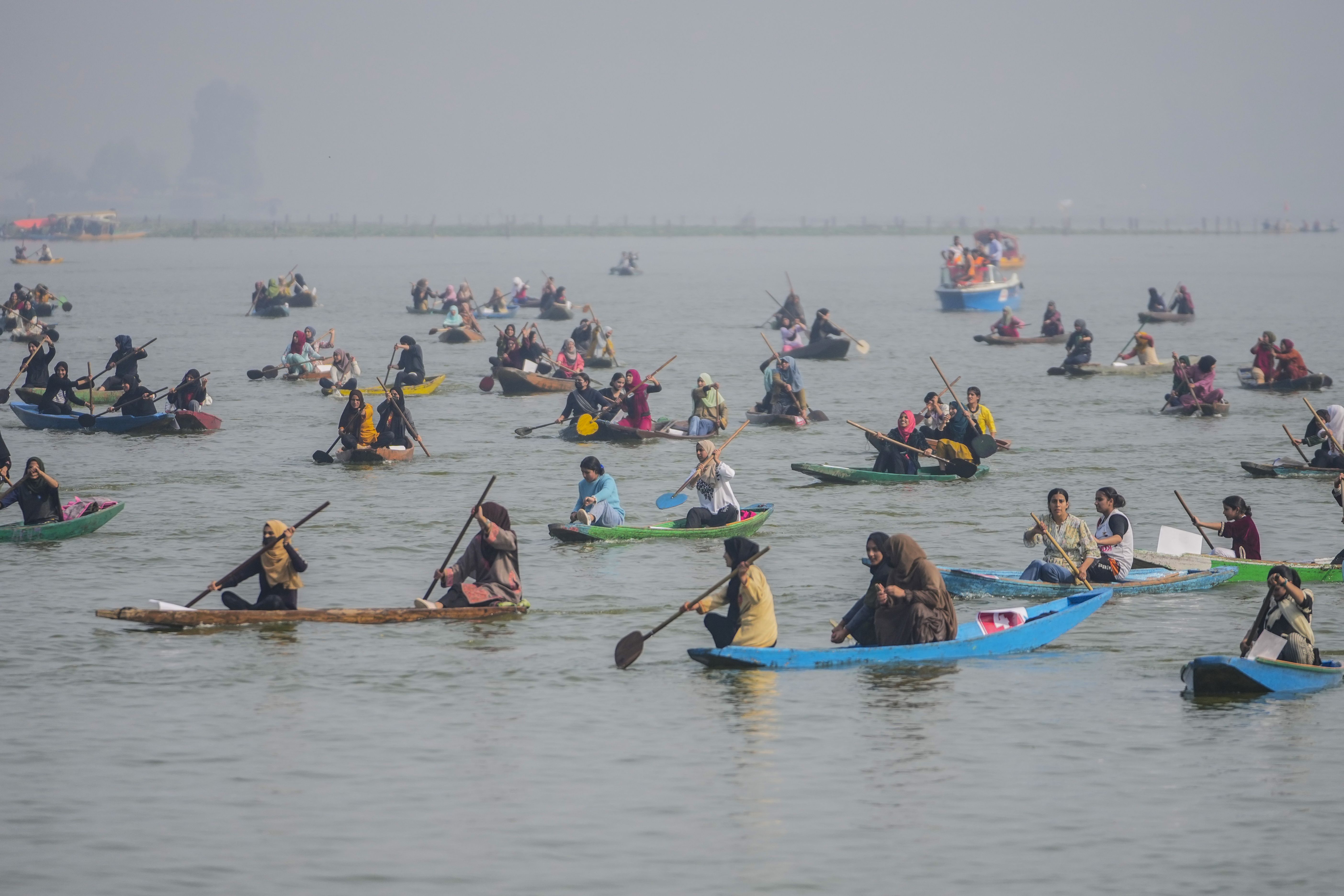 Participants row towards the finish line during the boat races in Dal Lake in Srinagar, Indian controlled Kashmir,Sunday, October 27, 2024. (Photo by Mukhtar Khan/AP Photo)
