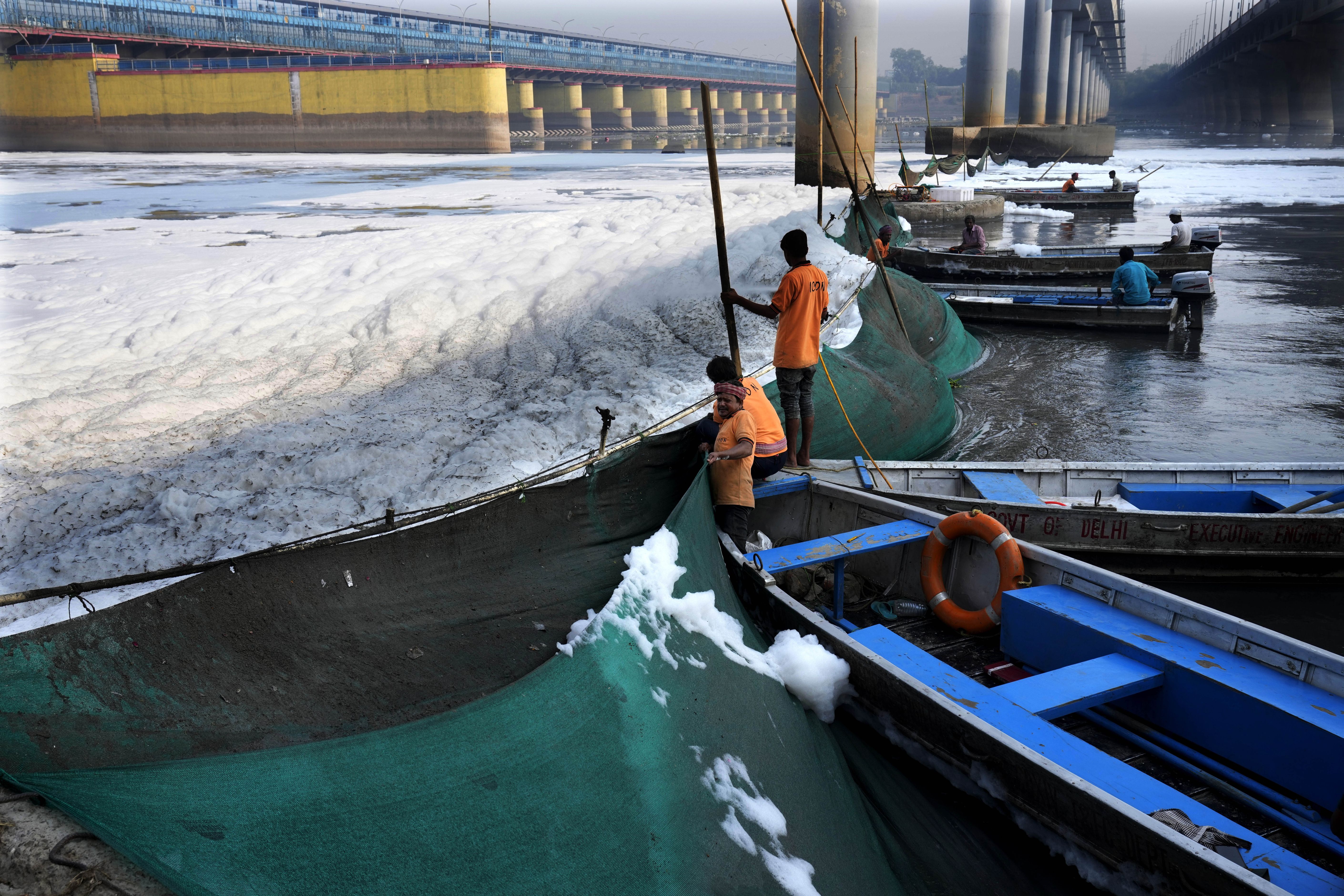 Workers for the Delhi Jal or water board put up a cloth curtain to stop the flow of the toxic foams floating in the river Yamuna in New Delhi, India, Tuesday, October 29, 2024. (Photo by Manish Swarup/AP Photo)