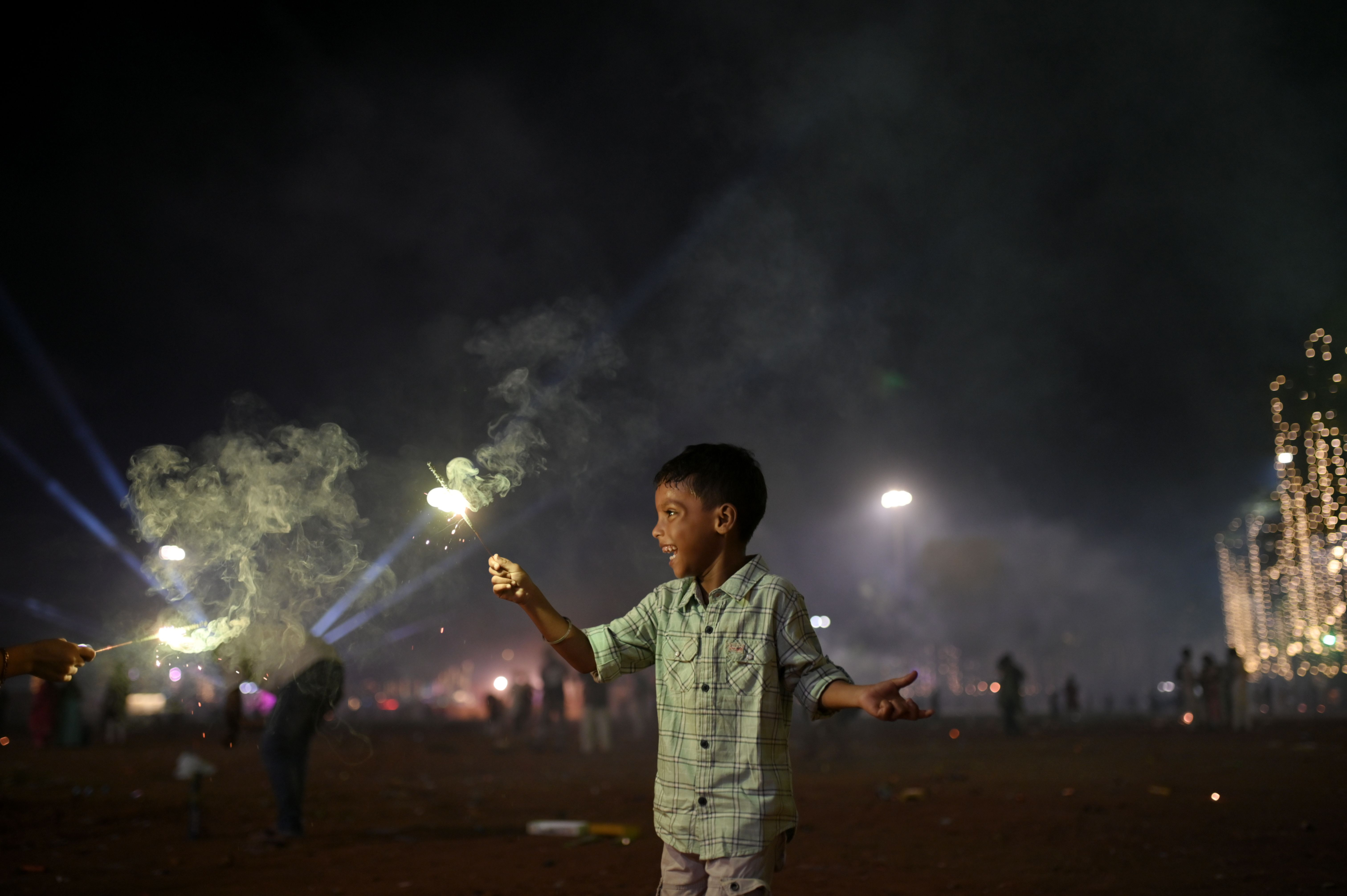 A boy plays with firecrackers during Diwali, the Hindu festival of lights, in Mumbai, India, on October 31, 2024. (Photo by Indranil Aditya/NurPhoto/Rex Features/Shutterstock)