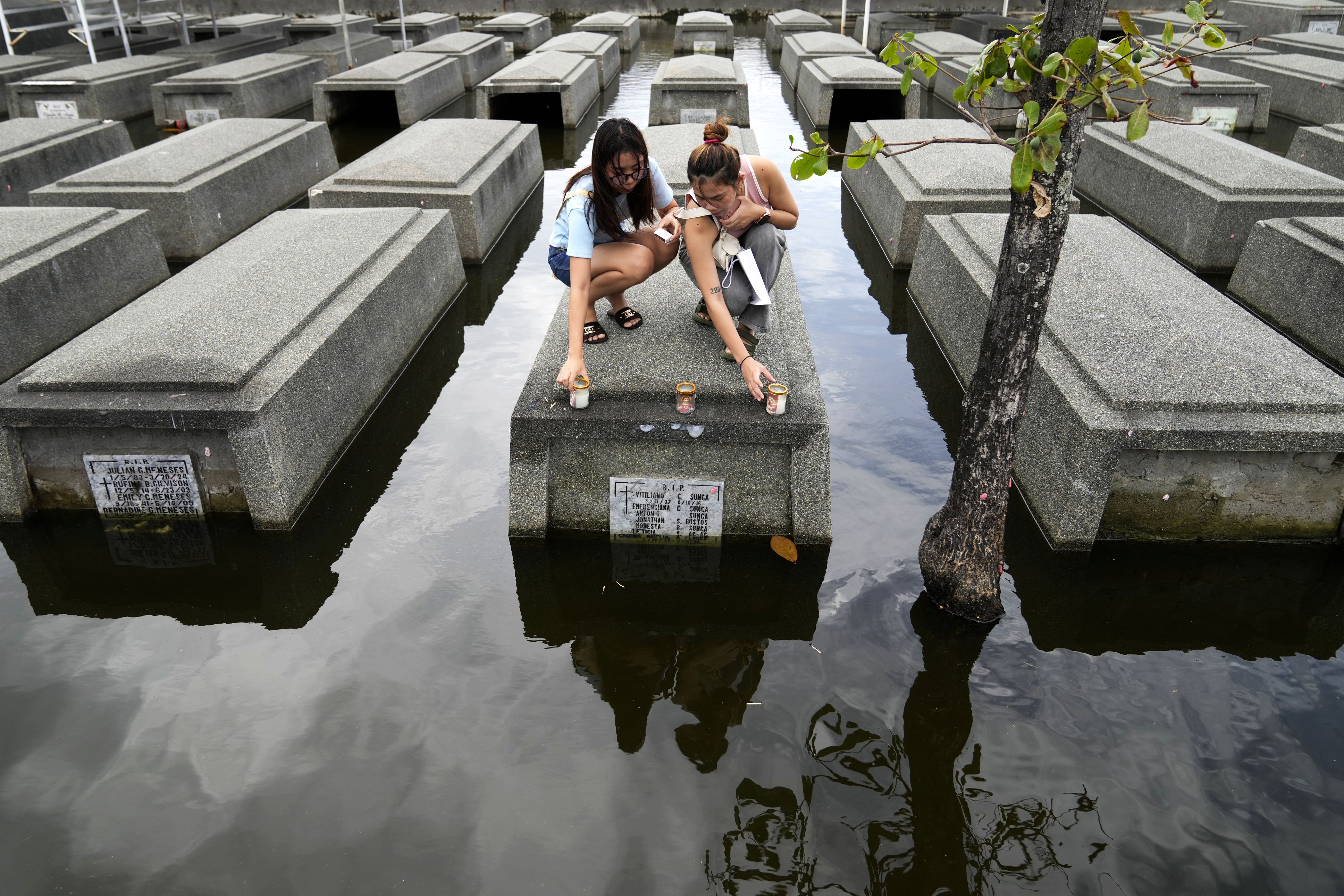 Women place candles on the half-submerged tomb of family members at flood-prone Holy Spirit Memorial Park in Masantol, Pampanga province, Philippines after heavy rains from recent tropical storm Trami caused water to become higher than usual, ahead of All Saints Day, Thursday October 31, 2024. (Photo by Aaron Favila/AP Photo)