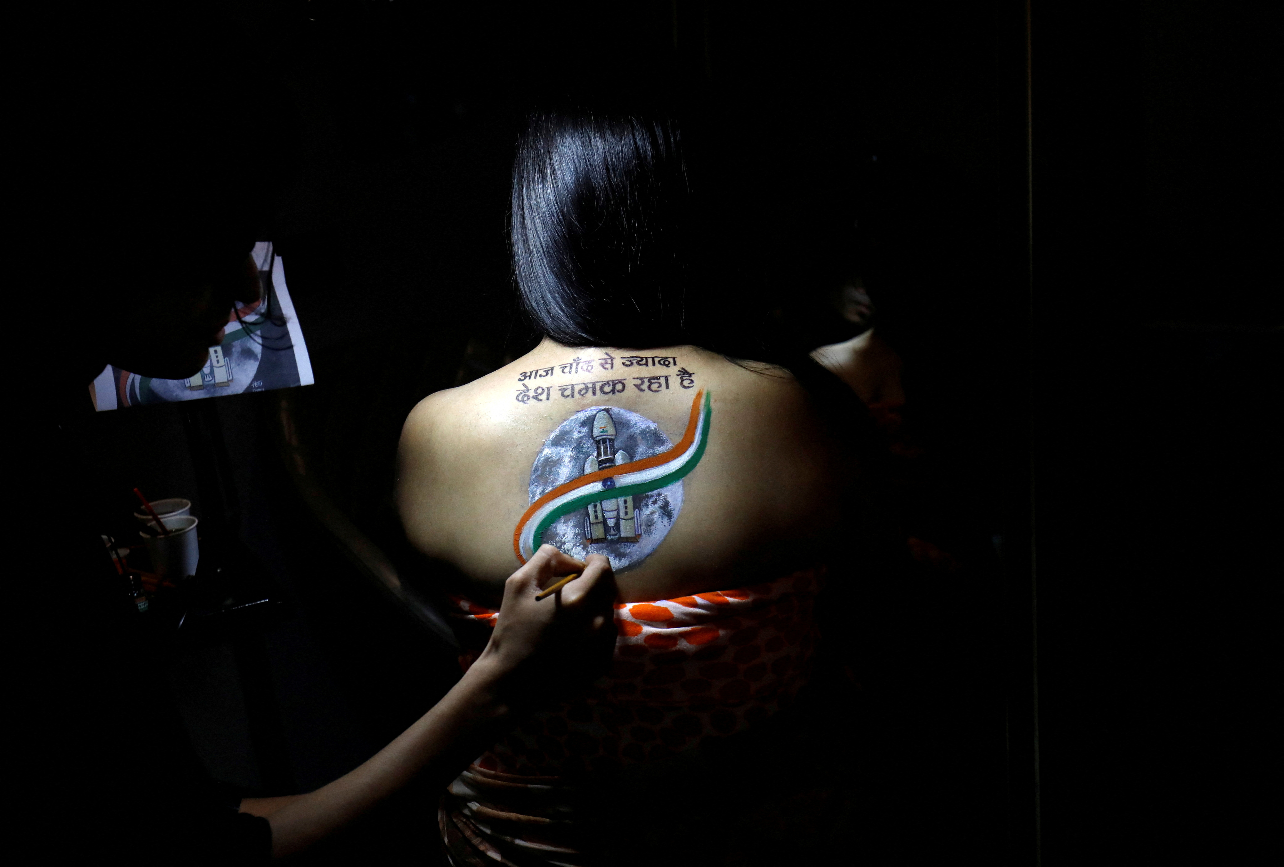 An artist applies final touches to a tattoo sketch on the back of a woman, depicting India's LVM3 M4 carrying Chandrayaan-3 spacecraft, to celebrate the landing of the spacecraft on the Moon, inside a tattoo studio in Ahmedabad, India on August 24, 2023. The words of the tattoo read: “Today the country shines more than the Moon”. (Photo by Amit Dave/Reuters)
