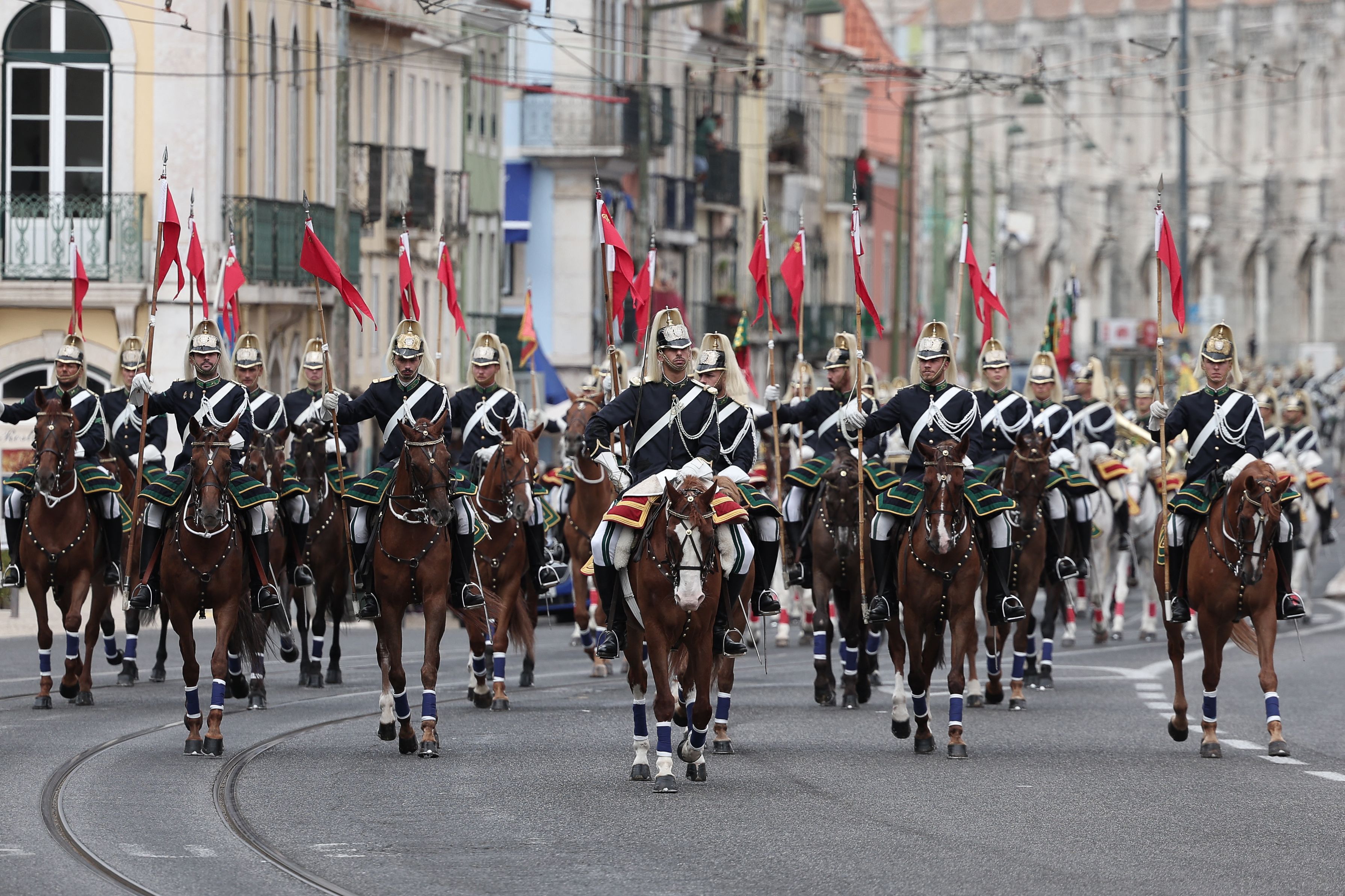 Members of the Guarda Nacional Republicana (Portuguese National Republican Guard) on horseback parade in Belem, Lisbon, during a welcome ceremony as part of the Pope's five-day visit to attend the World Youth Day (WYD) gathering of young Catholics, on August 2, 2023. Pope Francis arrived in Lisbon today to gather with a million youngsters from across the world at the World Youth Day (WYD), held as the Church reflects on its future. The 86-year-old underwent major abdominal surgery just two months ago, but that has not stopped an event-packed 42nd trip abroad, with 11 speeches and around 20 meetings scheduled. (Photo by Thomas Coex/AFP Photo)