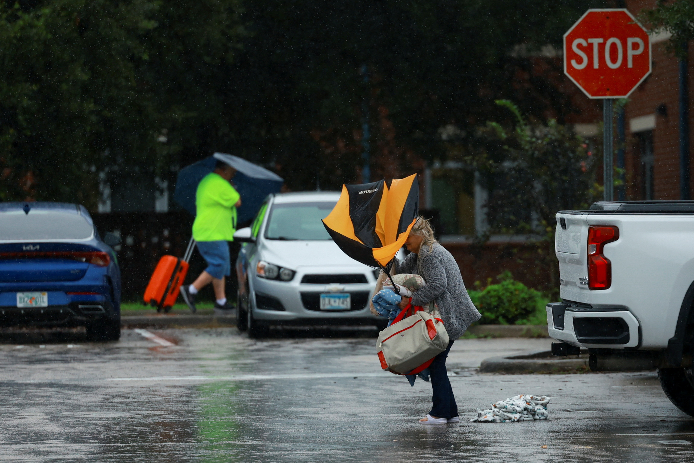 A woman holds an umbrella while arriving at a shelter as Hurricane Milton approaches, in Lakeland, Florida, U.S., on October 9, 2024. (Photo by Jose Luis Gonzalez/Reuters)