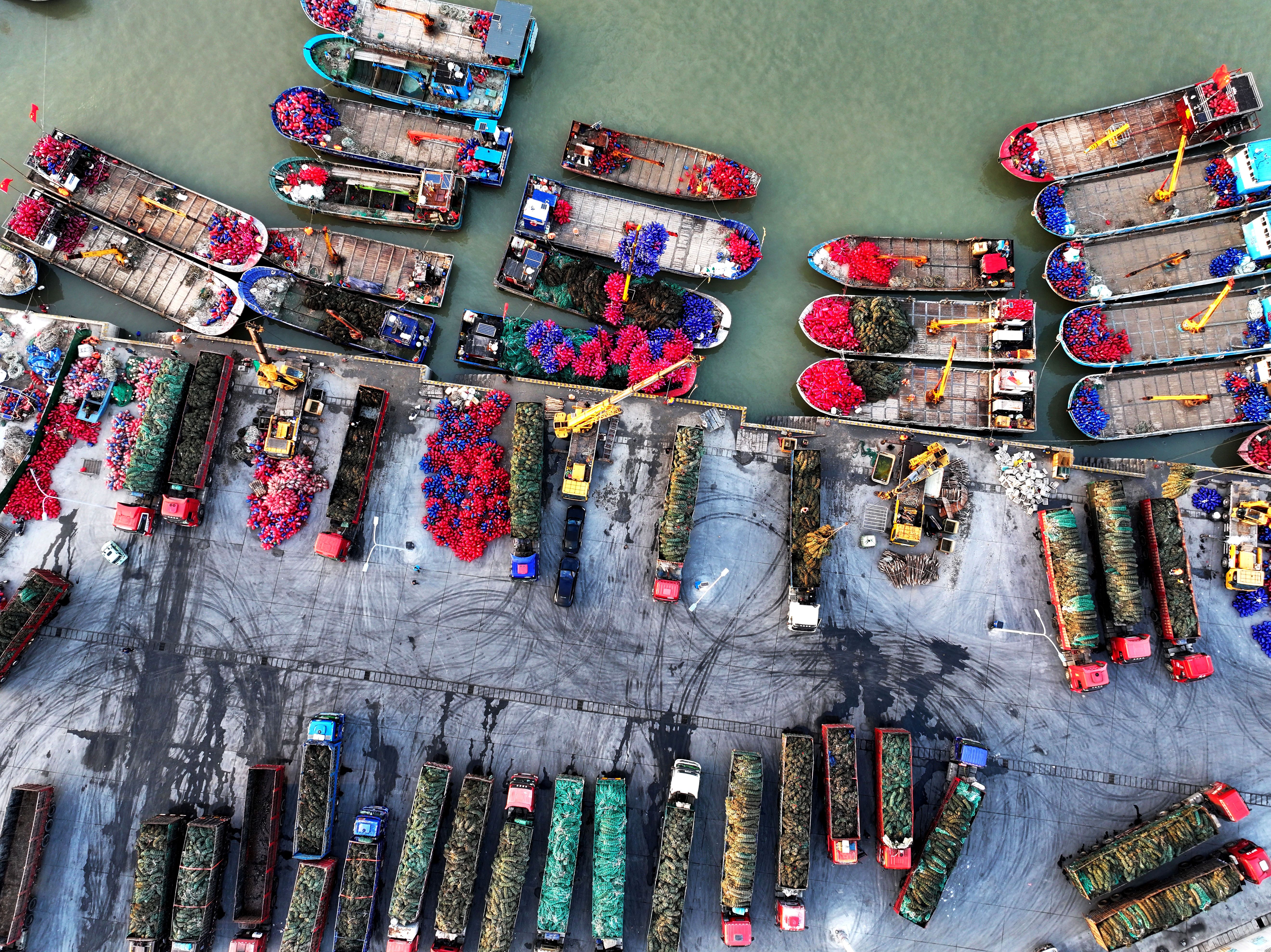 The farmers lift the cage oysters into the boat and put them into the sea for temporary breeding at the Liandao Central fishing port in Lianyungang, China, on October 28, 2024. (Photo by Costfoto/NurPhoto/Rex Features/Shutterstock)