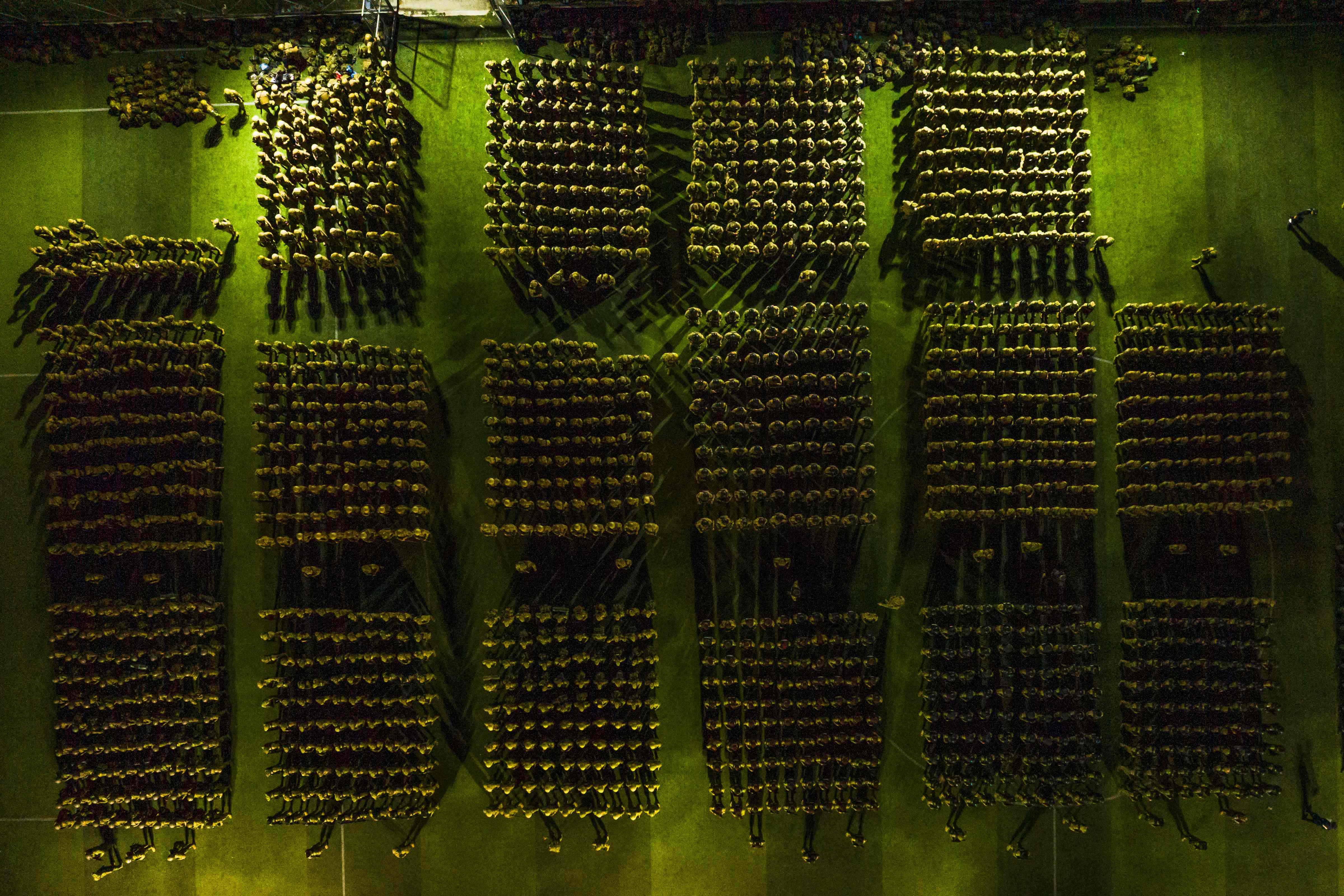 Handout picture released by El Salvador's Presidency Press Office showing an aerial view of soldiers standing guard before taking part in an operation to arrest gang members in San Marcos, El Salvador, in the early hours of October 28, 2024. Around 2,500 soldiers and police surrounded a shantytown on the outskirts of San Salvador to arrest gang members, the country's president, Nayib Bukele, announced on Monday. (Photo by El Salvador's Presidency Press Office/Handout via AFP Photo)