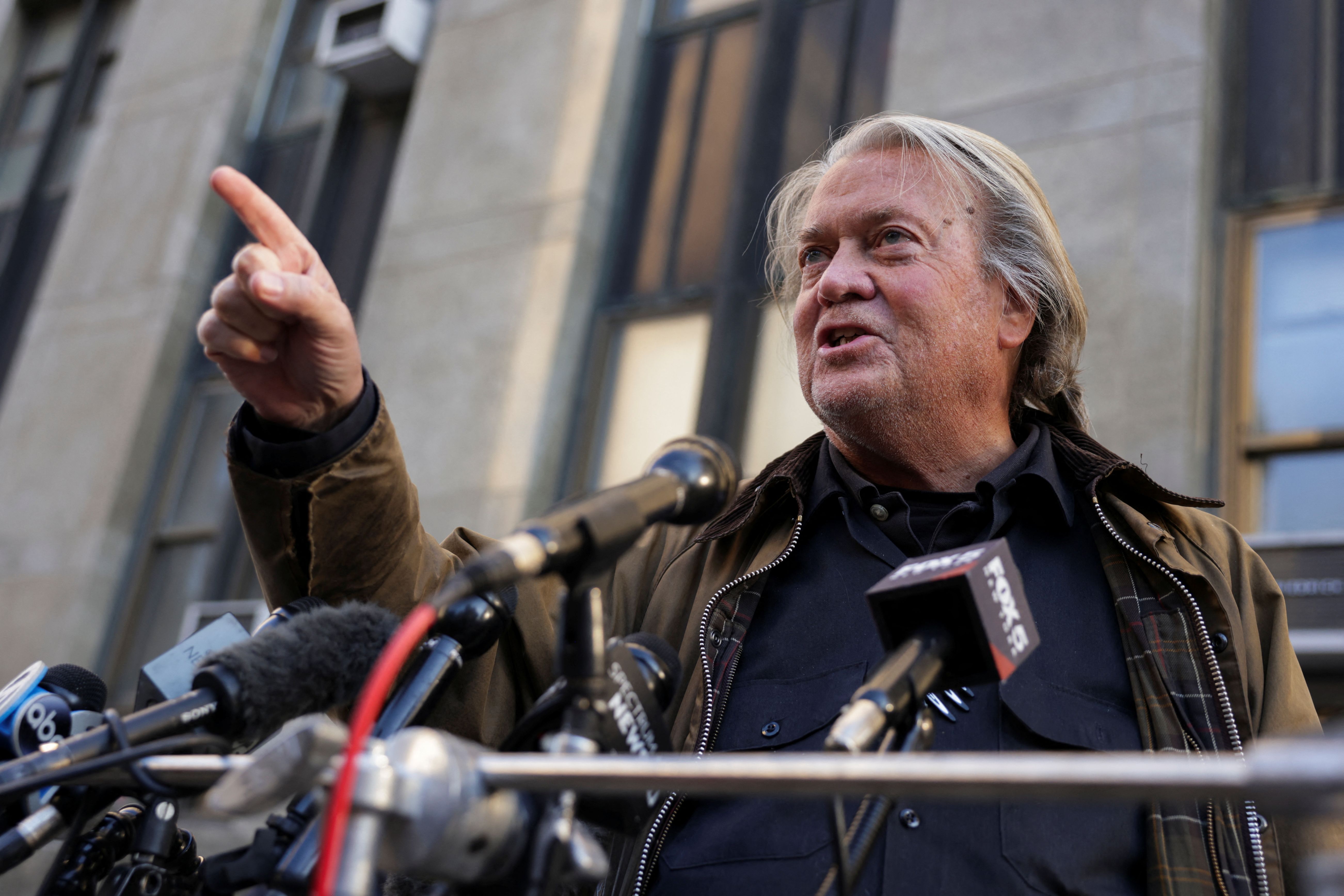 Steve Bannon, former advisor to former U.S. President and now President-elect Donald Trump, speaks with the media outside New York Criminal Court, on the day of a pre-trial conference hearing in his fraud case stemming from a fundraising effort to build a border wall, in New York City on November 12, 2024. (Photo by Kent J. Edwards/Reuters)
